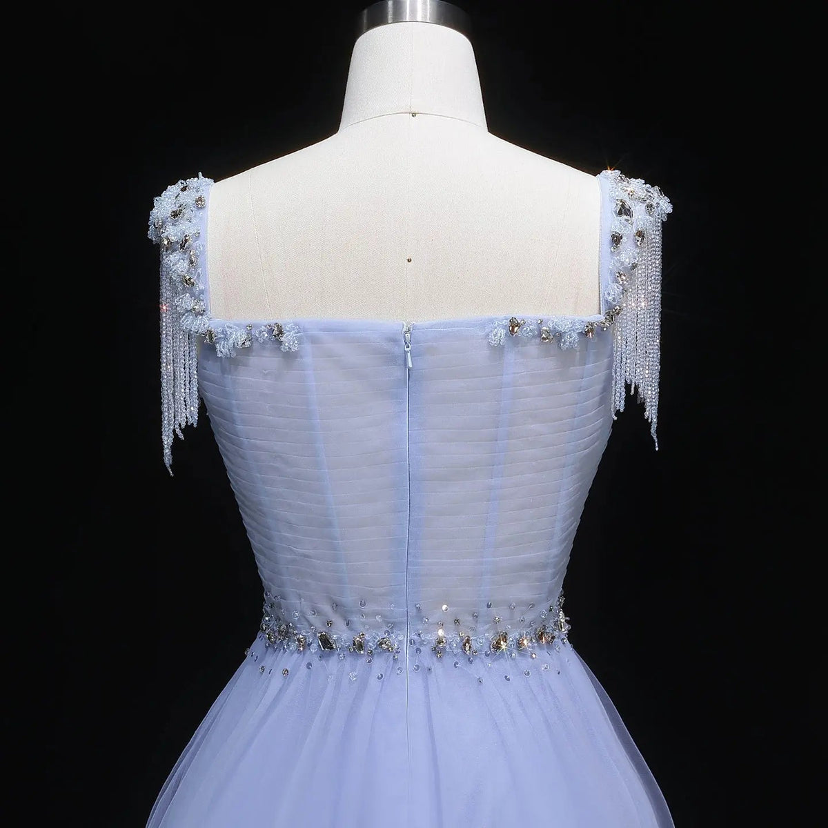 Elegant Light Blue Beaded Tulle A Line Evening Dress Sparkly Princess Gown SS058