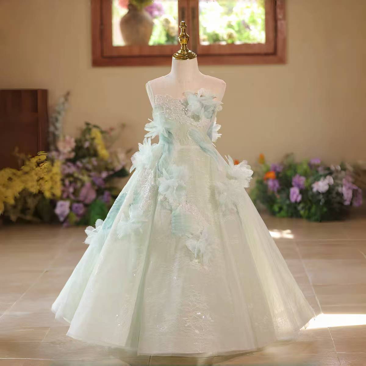 This Elegant Mint Green Princess Dress combines delicate floral accents with shimmering tulle for a sophisticated look. Crafted to enhance comfort and style, its soft fabric and intricate details create an enchanting silhouette perfect for special occasions. The subtle sparkle of the tulle adds a refined touch, making this dress a standout choice for those seeking elegance with a youthful charm.