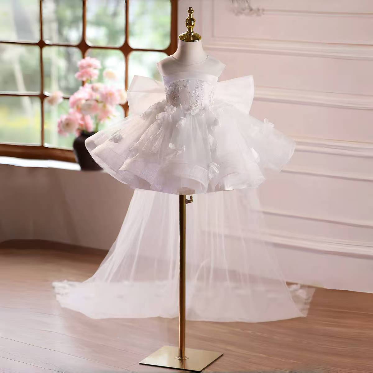 Elegant White Princess Flower Girl Dress with Beaded Bodice and Bow Back D145