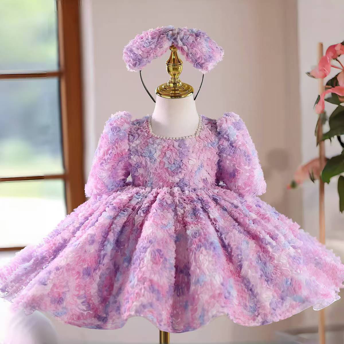 This knee-length flower girl dress features delicate lilac lace, offering an elegant and timeless design perfect for birthday parties and formal events. Crafted to provide a comfortable fit, it highlights intricate floral patterns that add a charming and sophisticated touch to your child’s special occasion attire.