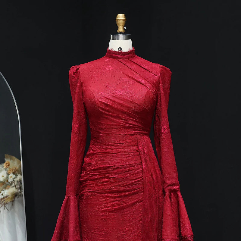 Burgundy Evening Dress with High Neck and Lace Long Flare Sleeves SF484