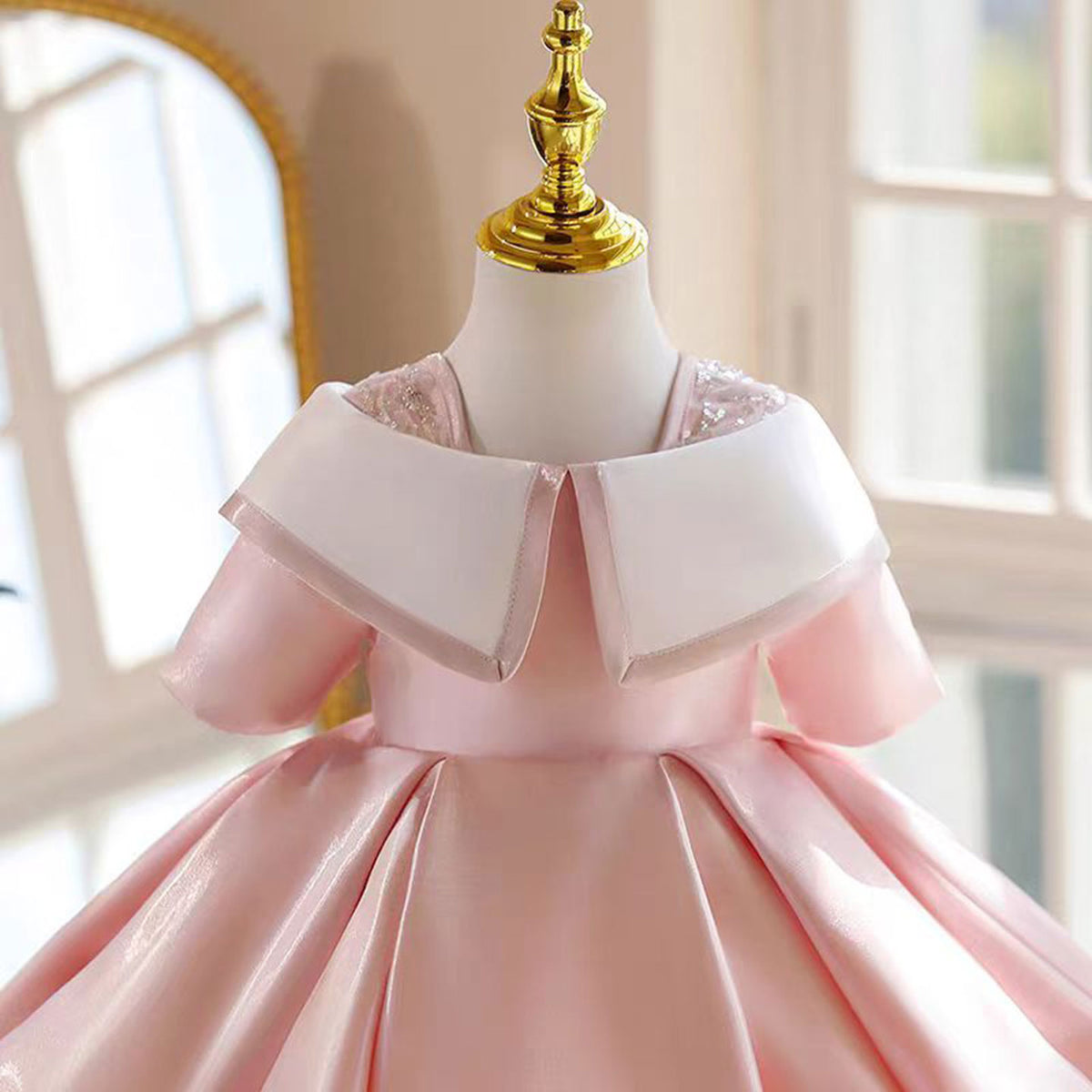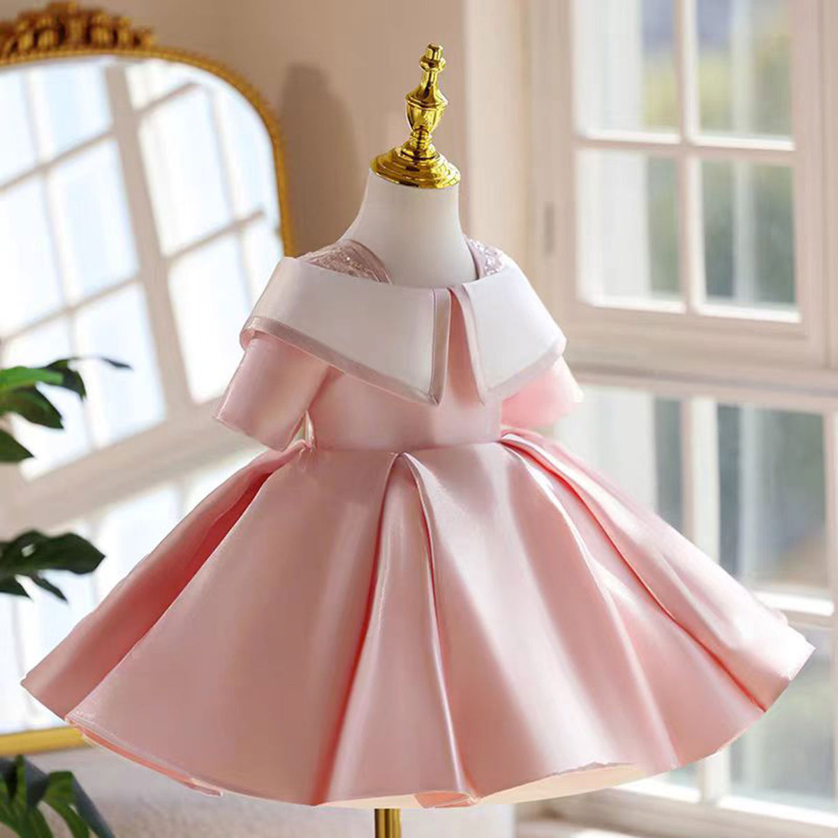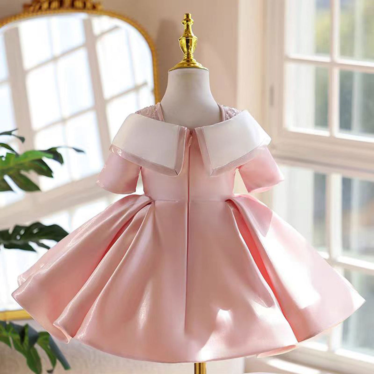 Adorable Designed Neck Satin Pink Flower Girl Dress Half-Sleeve J864