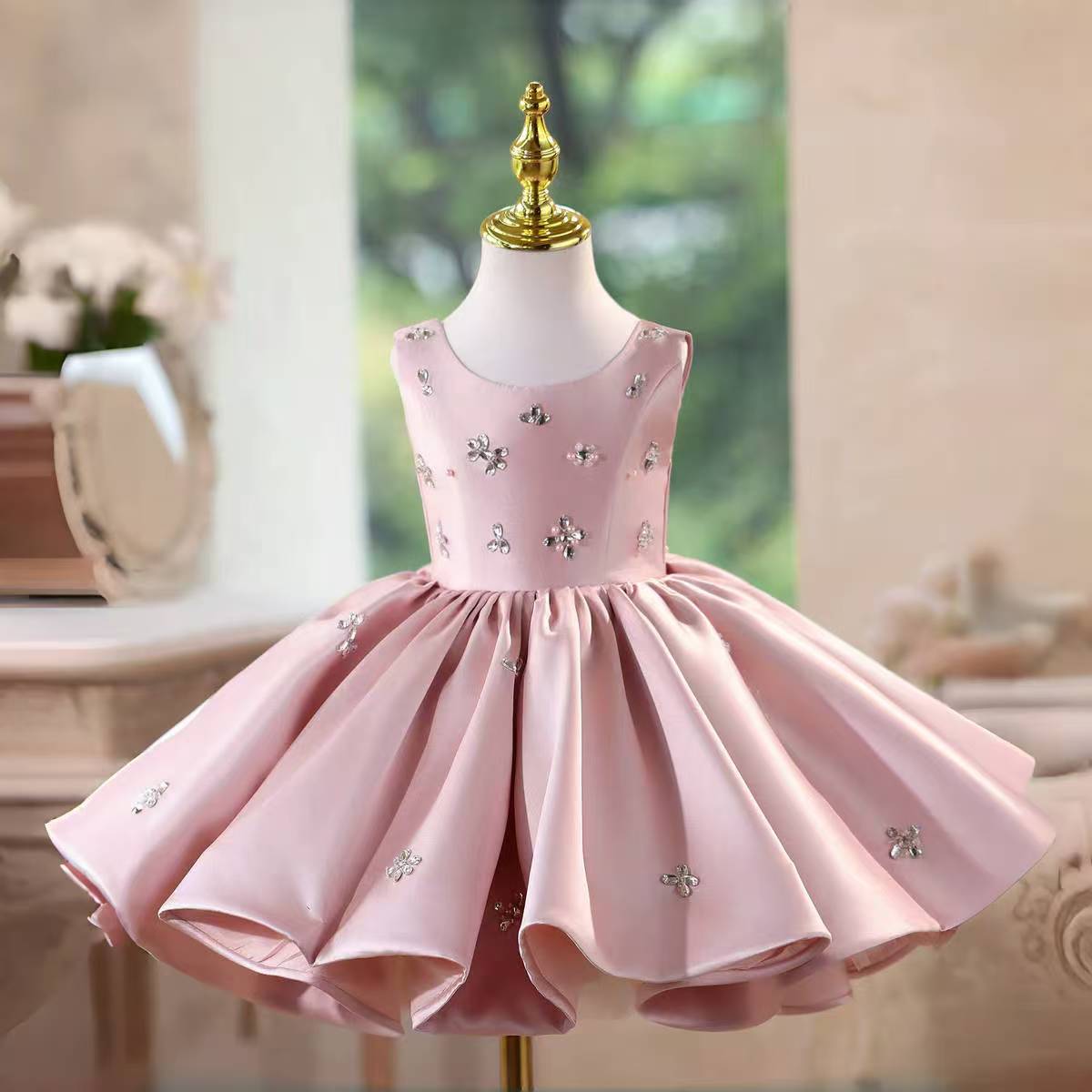 This knee-length girl's dress combines soft pink satin with sparkling crystal accents, creating a refined look ideal for birthday celebrations and special occasions. Designed for comfort and style, it offers a graceful fit that allows ease of movement while adding an elegant touch to any party ensemble.