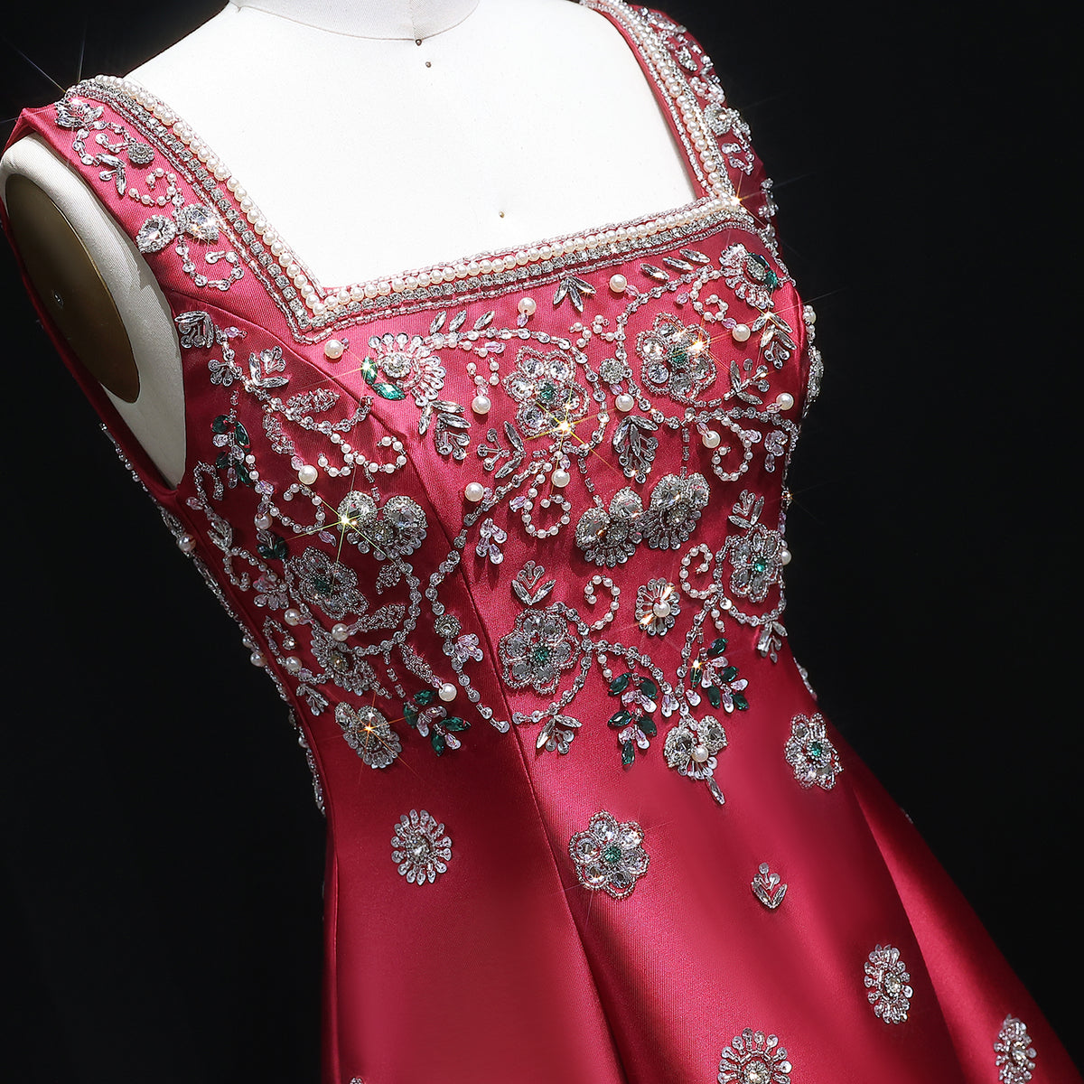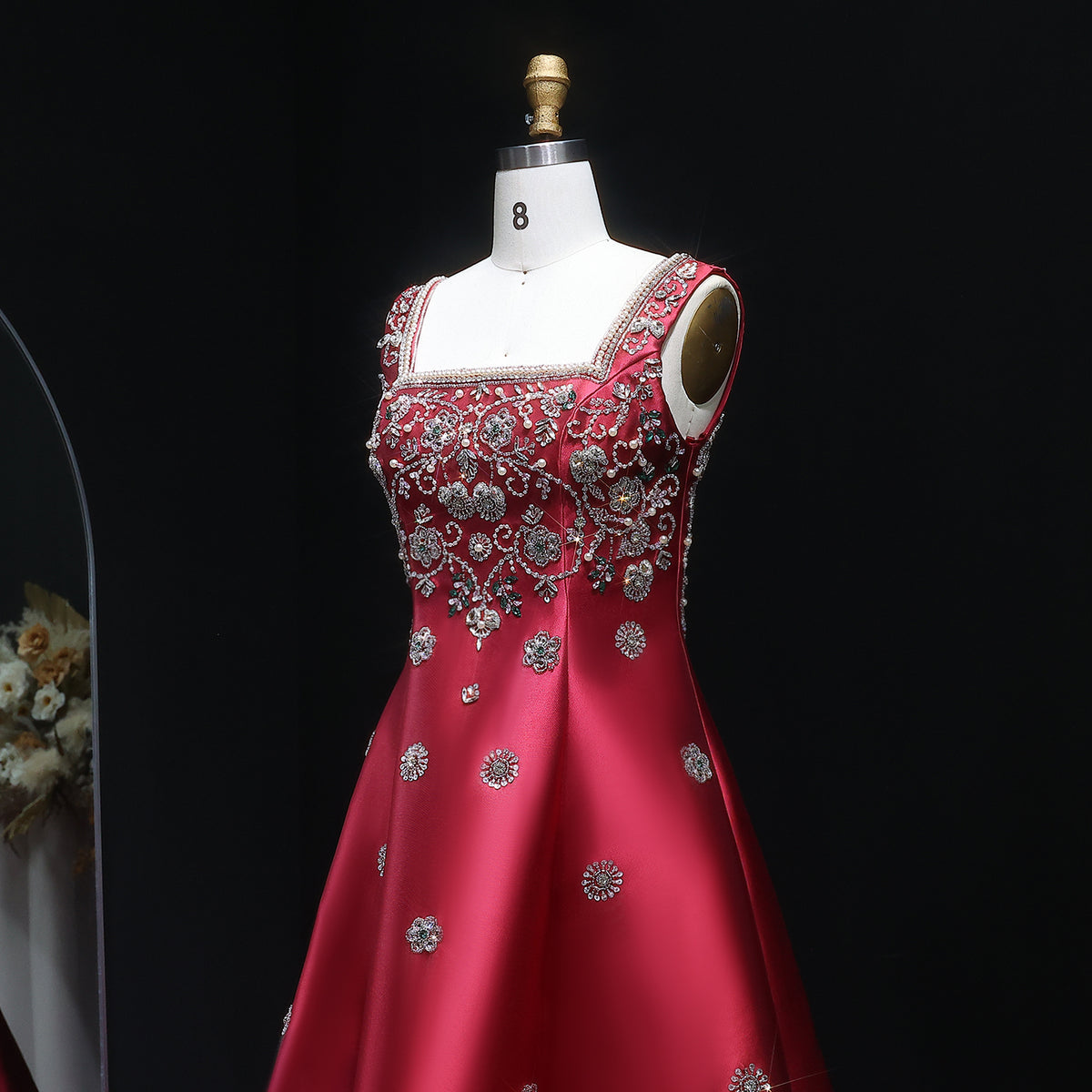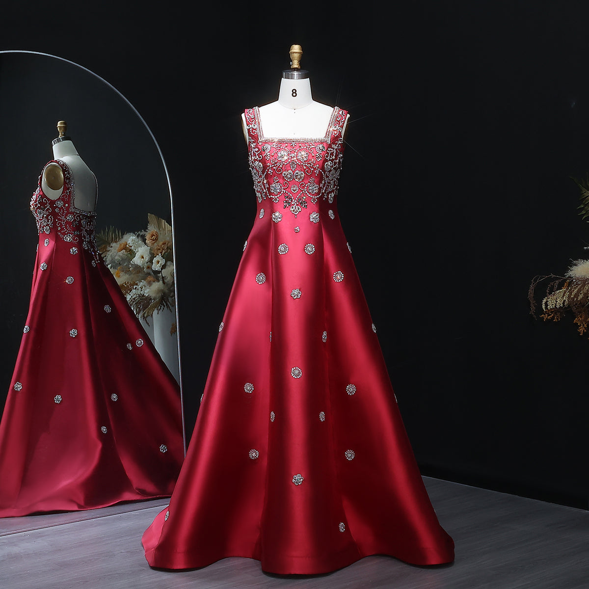 Luxury Burgundy Beaded Square Neck Evening Dress XD-065