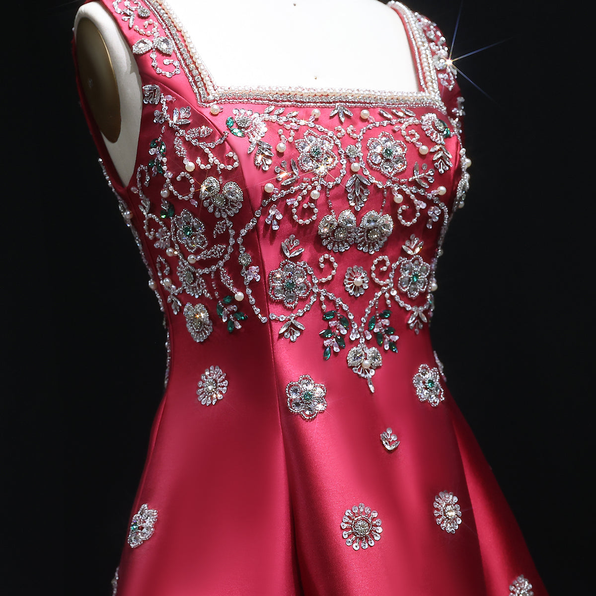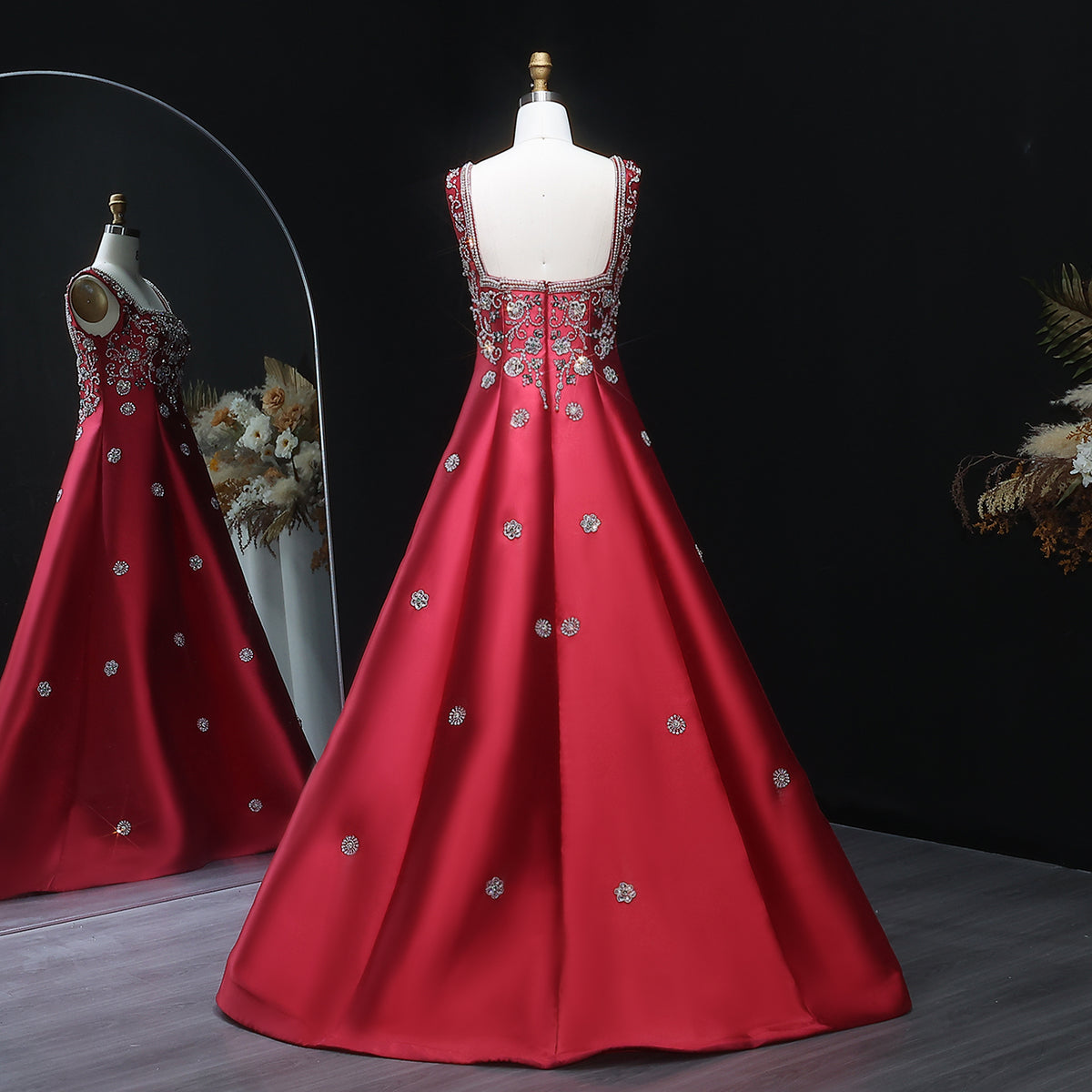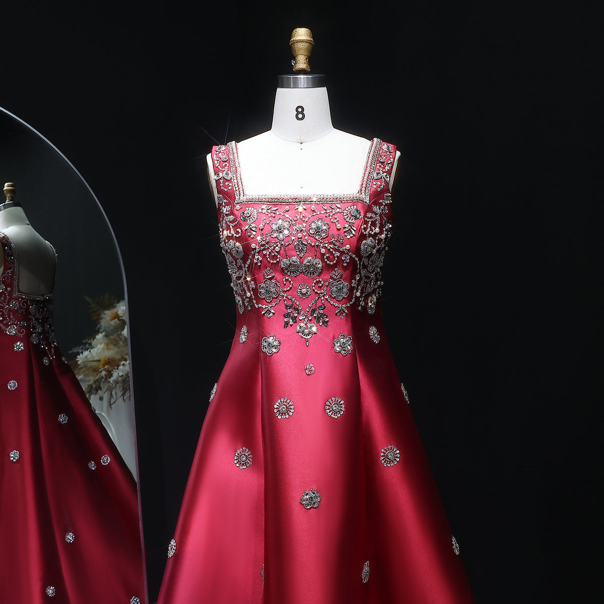 Luxury Burgundy Beaded Square Neck Evening Dress XD-065