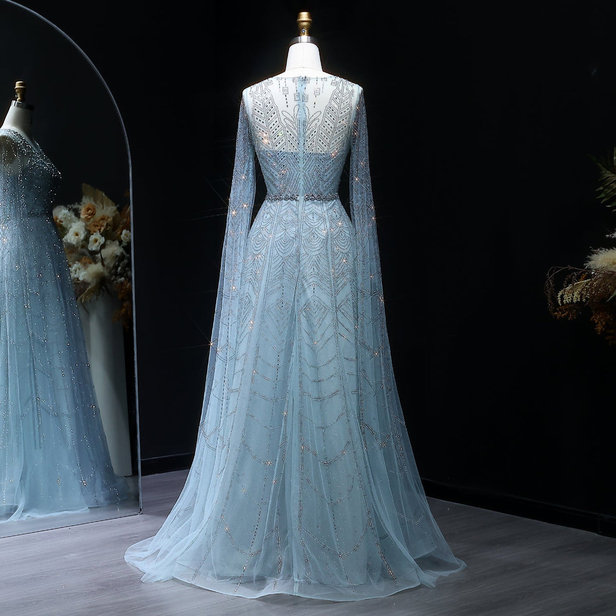 Luxury Crystal Blue Evening Dress with Cape Sleeves SS030