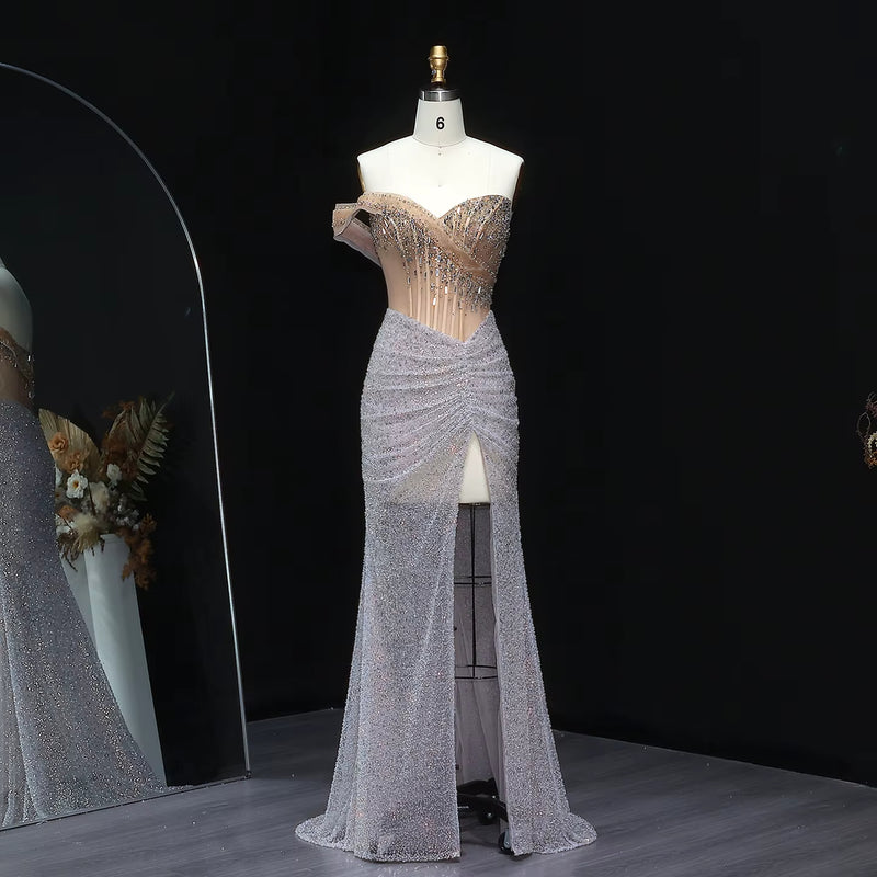 Elegant Off-Shoulder Beaded Evening Gown SS109