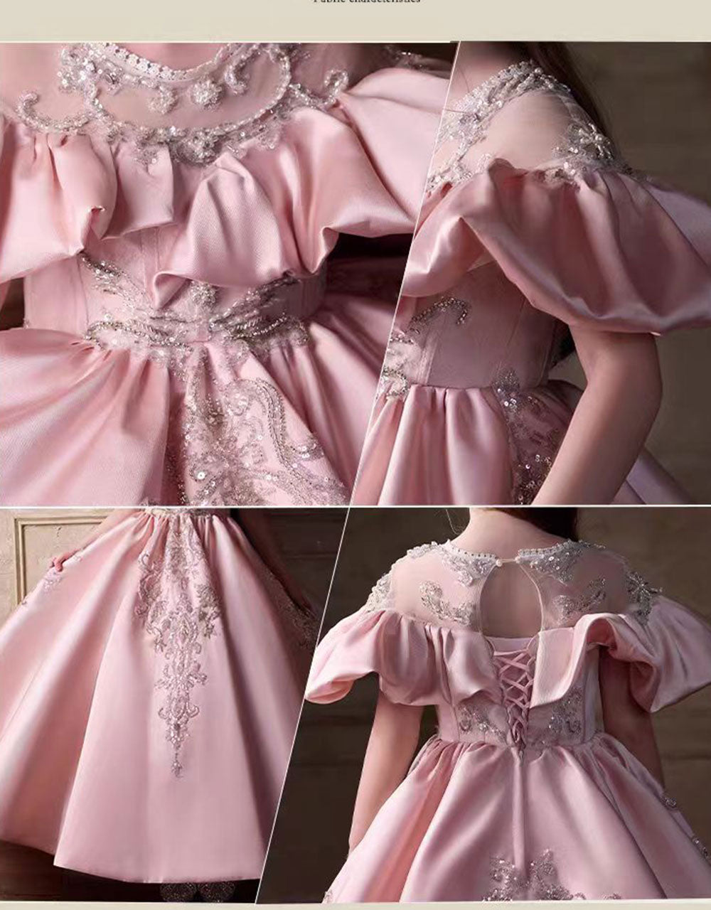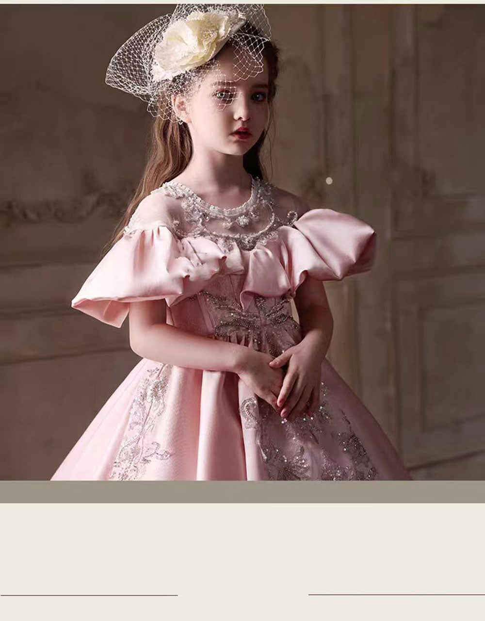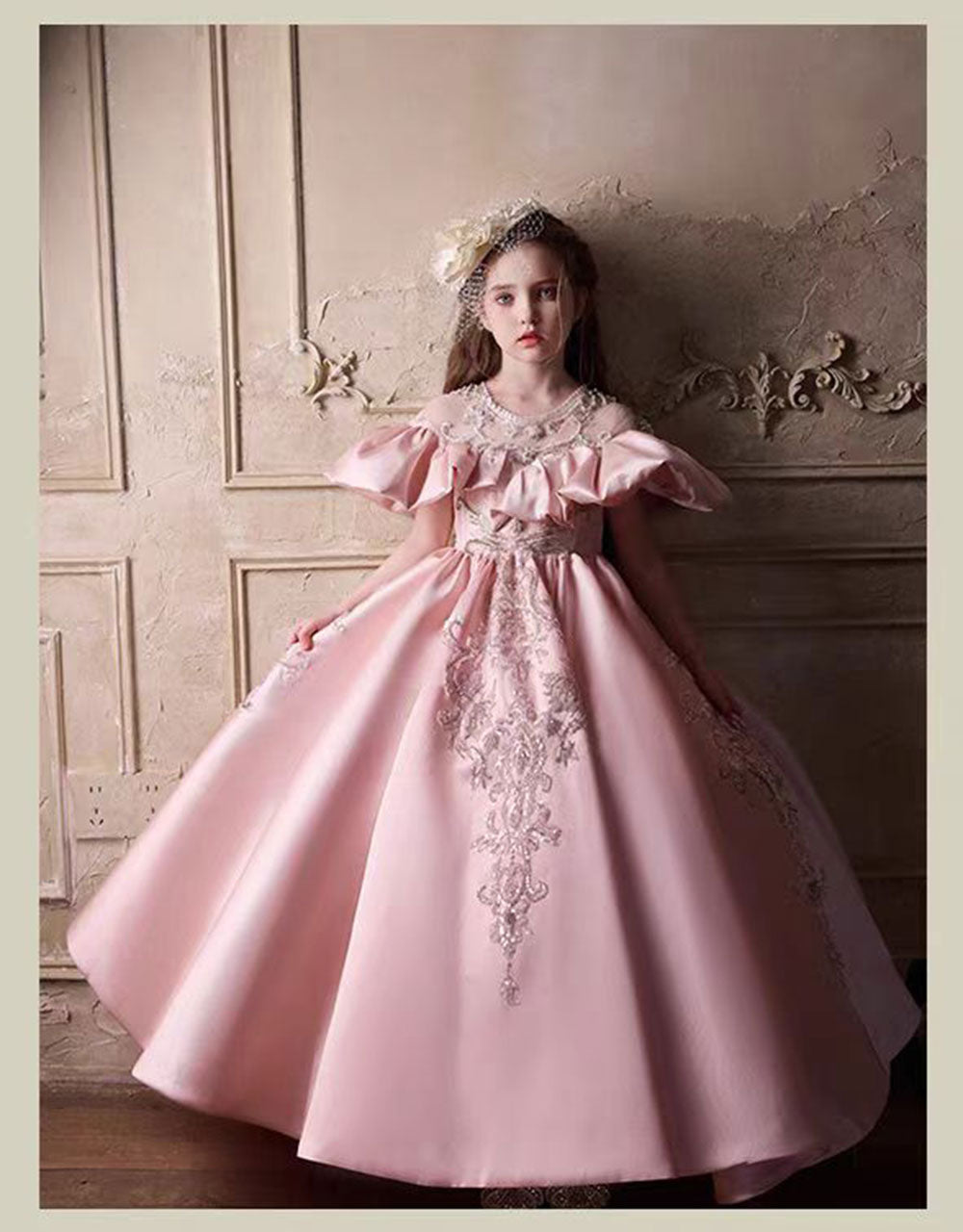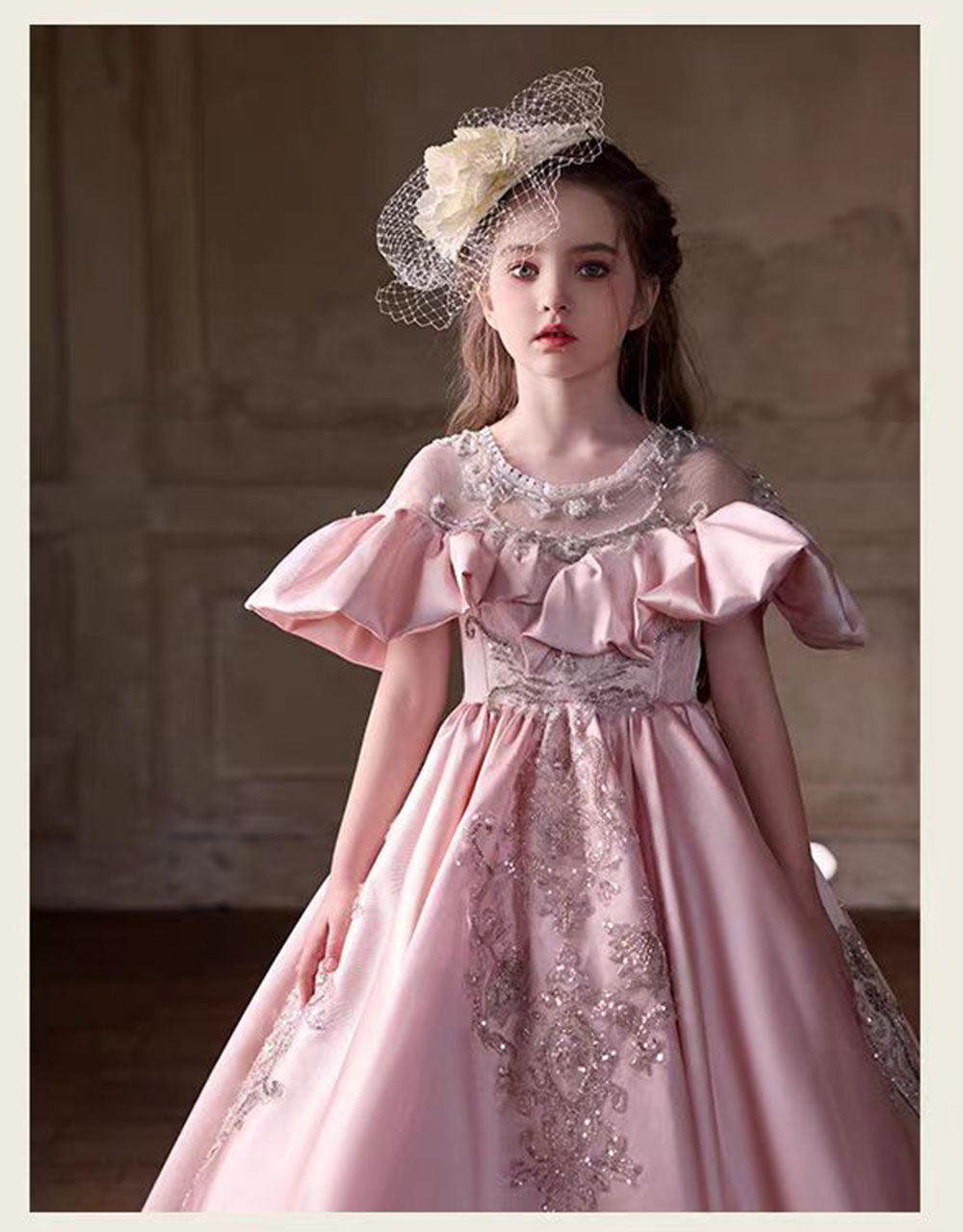 Embroidered Lace Stain Flower Princess Girl Dress Pink J255
