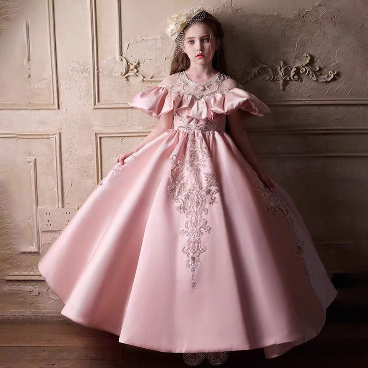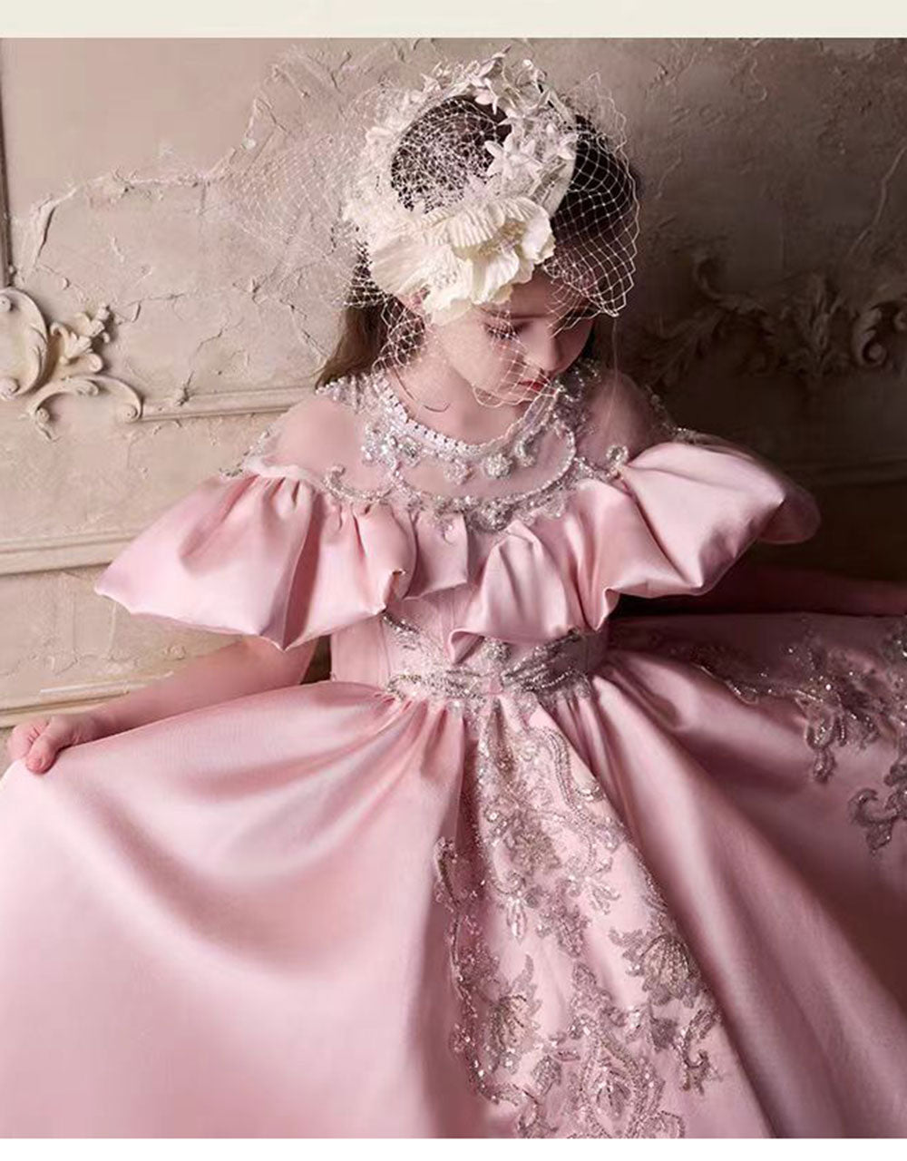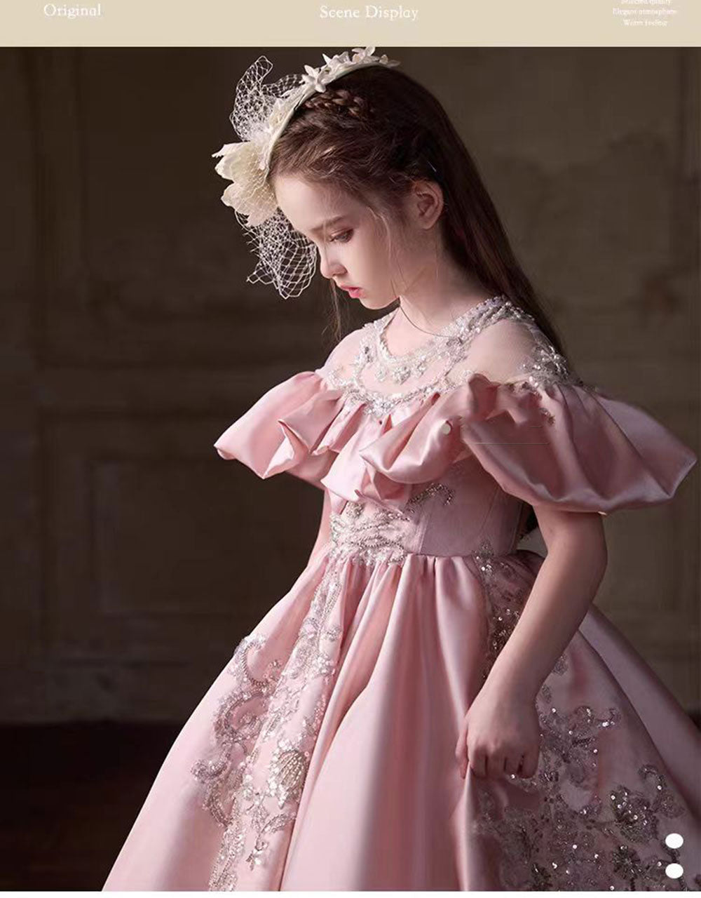 Embroidered Lace Stain Flower Princess Girl Dress Pink J255