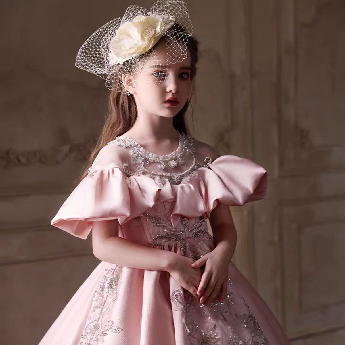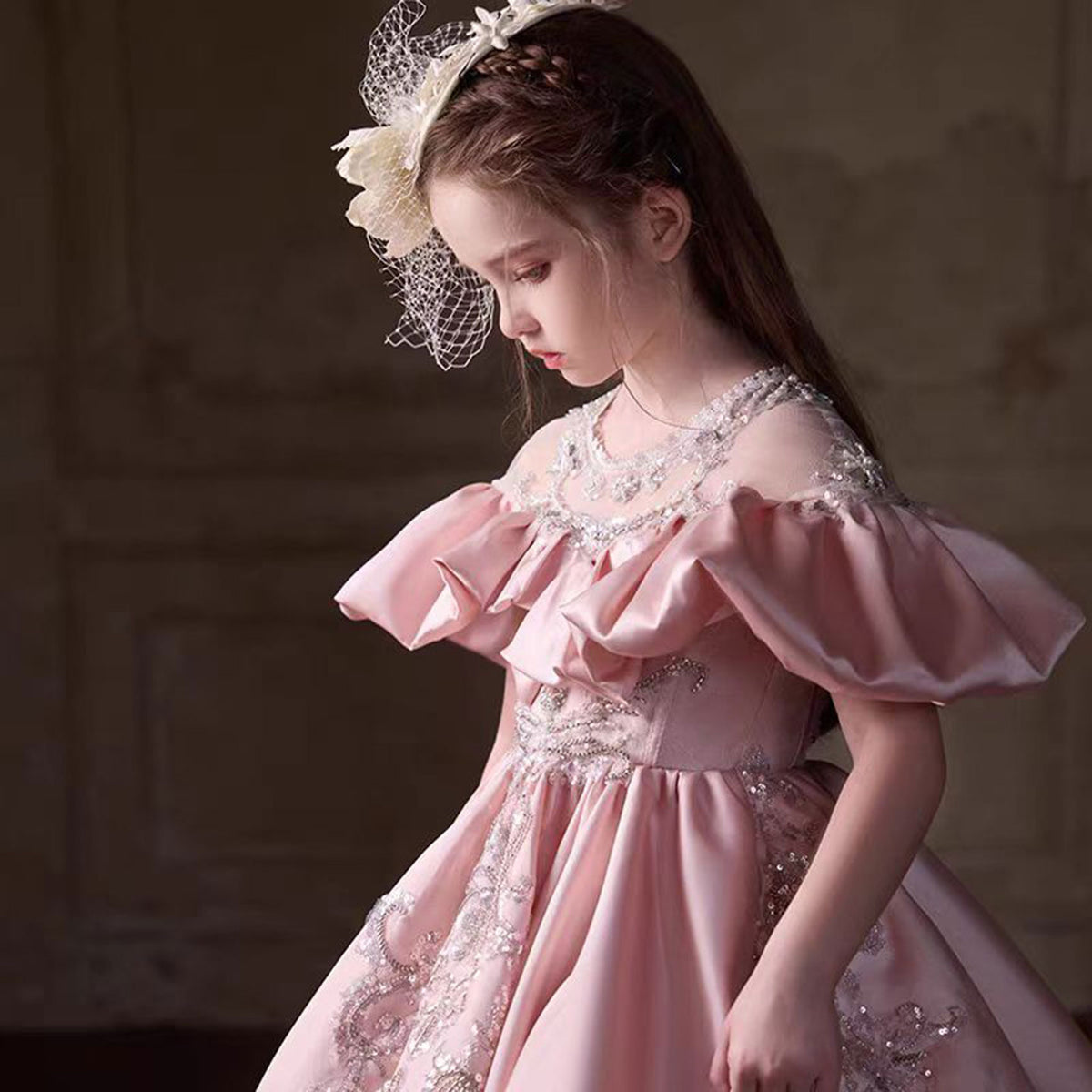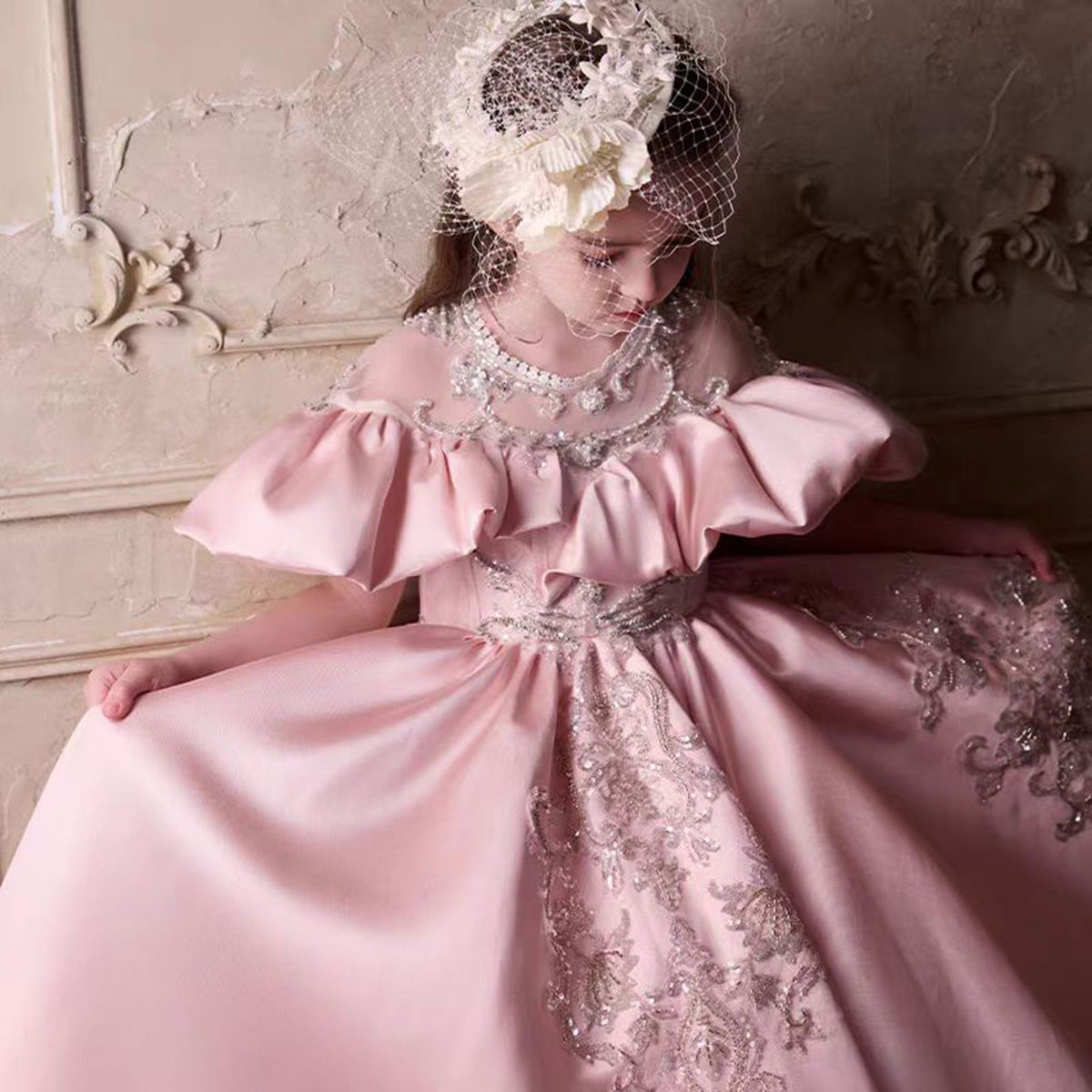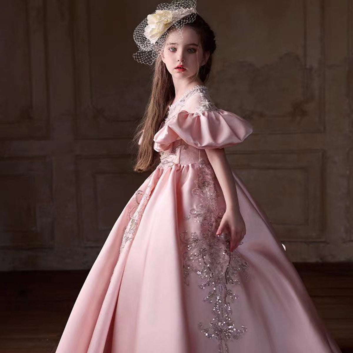 Embroidered Lace Stain Flower Princess Girl Dress Pink J255