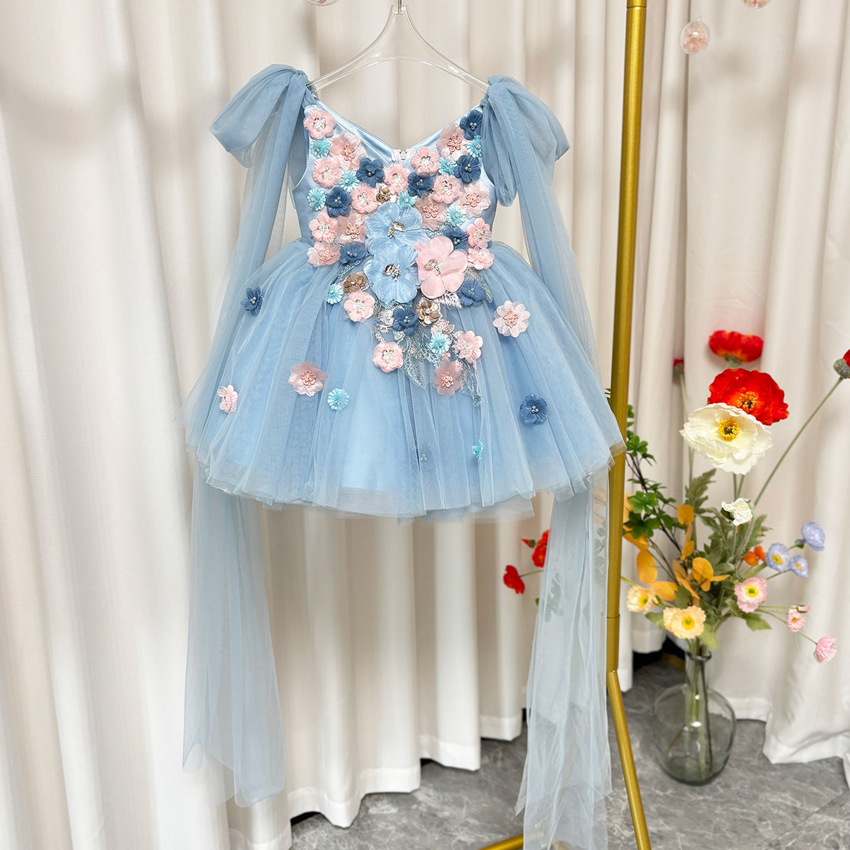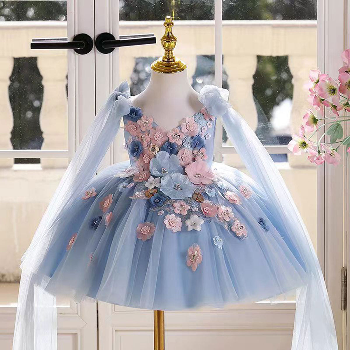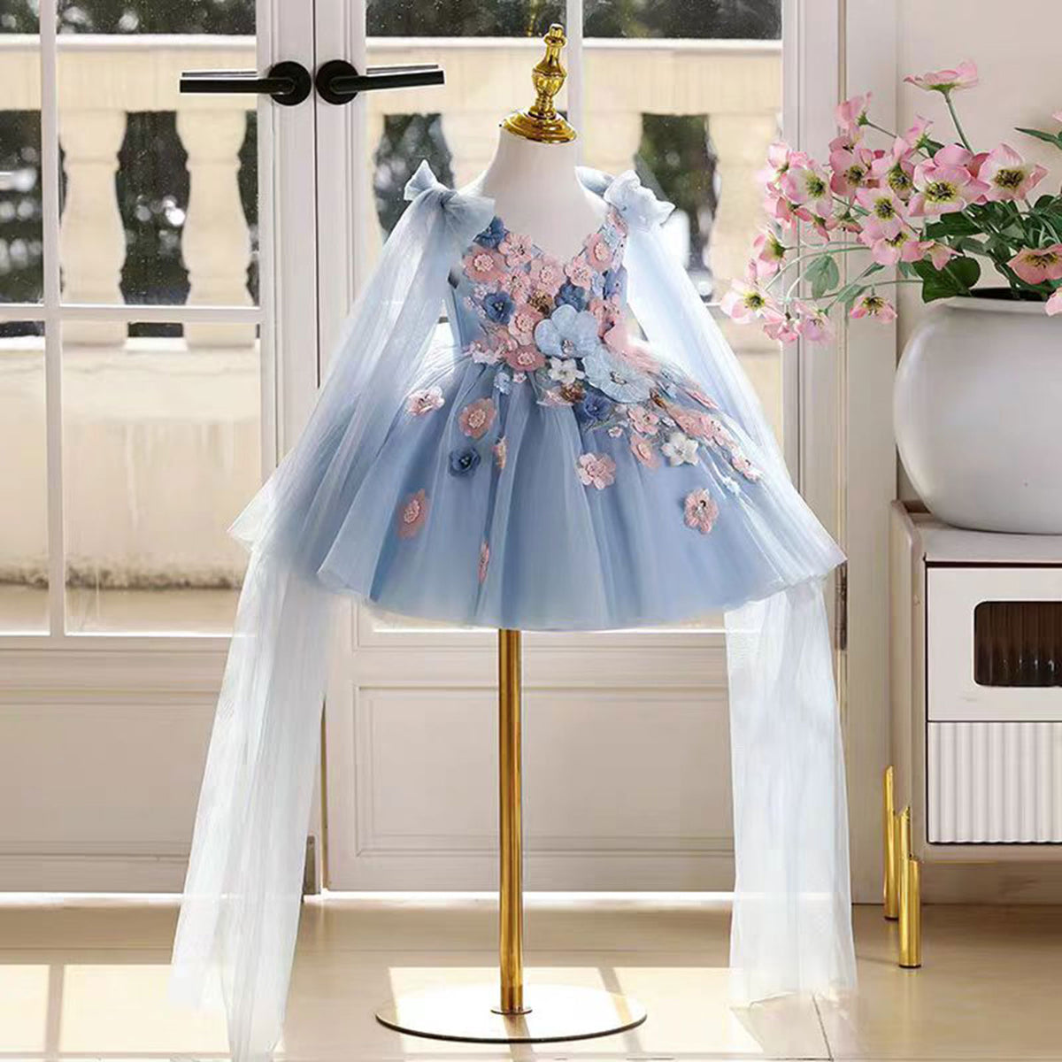Elegant V-Neck Applique Tulle Flower Girl Dress Cap Sleeve J535