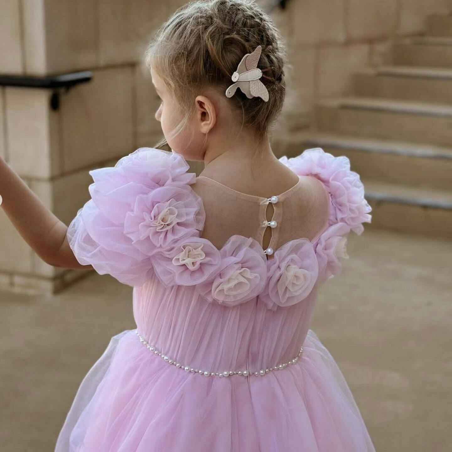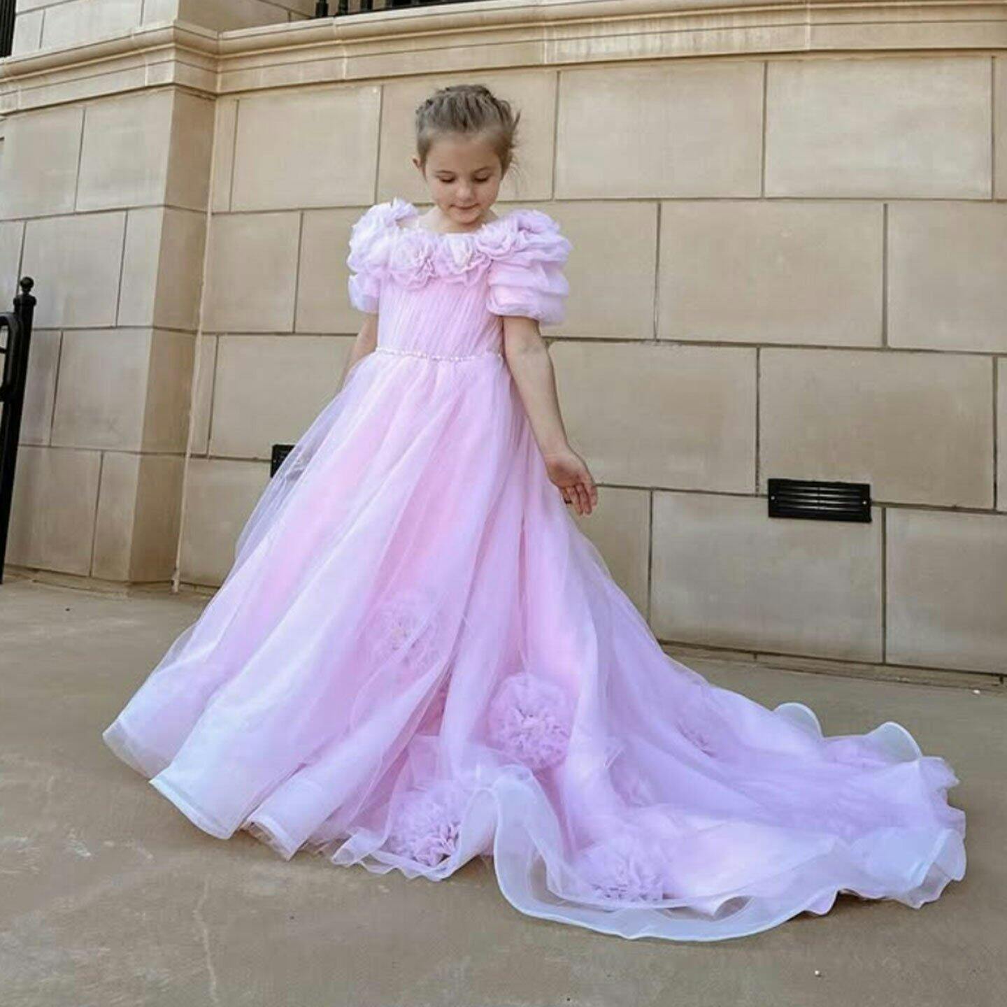 Luxury Arabic Pink Girl Dress Handmade Flowers Princess Gown J150