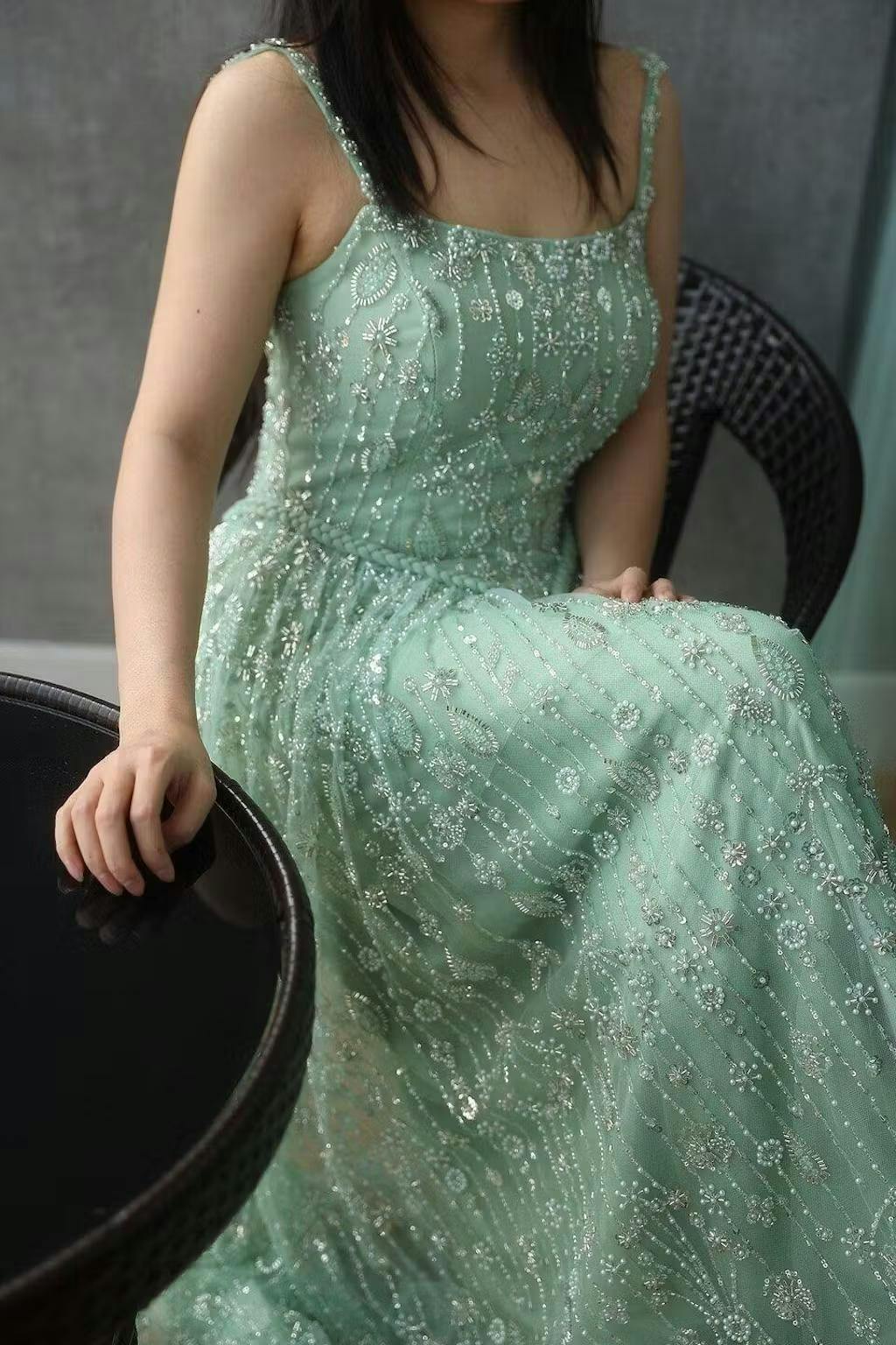 Elegant Sage Green Luxury Evening Dress with Spaghetti Straps SS693