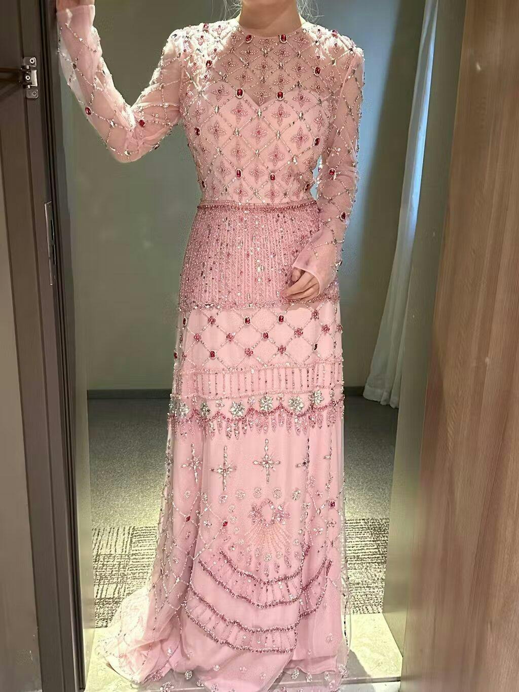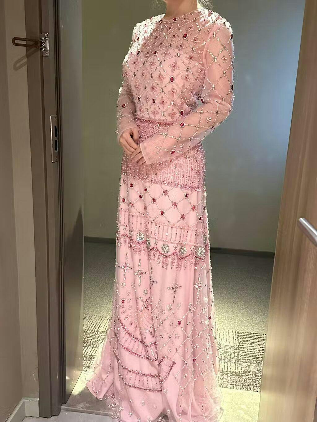 I ordered the same size as a size 14, with adjusted length and no slit, because the size 14 I tried on fit me perfectly. The finished dress is indeed beautiful, but the upper part is slightly looser than the one I tried on. It would have been perfect if the bust area was a little tighter, but it still fits well, and I had it perfectly altered at a tailor's shop.