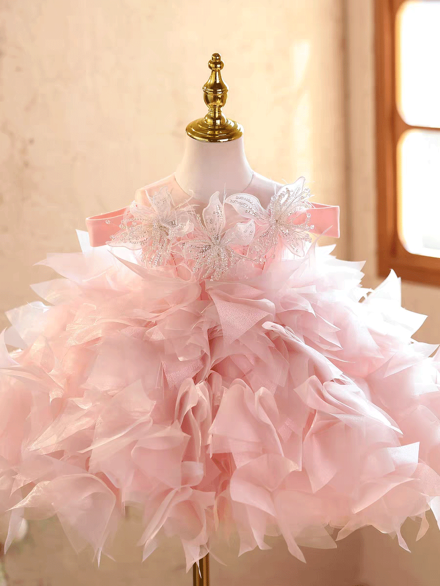 This enchanting girls' dress features luxurious pink feather tulle layered with delicate 3D flowers that create stunning dimension and visual appeal. The off-shoulder design showcases refined elegance, while the soft, flowing silhouette allows comfortable movement for twirling and dancing throughout the celebration. Crafted with premium materials and meticulous attention to detail, this dress is perfect for birthday parties, weddings, and special photo sessions. The playful floral embellishments combined with sophisticated tailoring make it an unforgettable choice that celebrates childhood wonder while ensuring your daughter feels truly special and confident on her big day.
