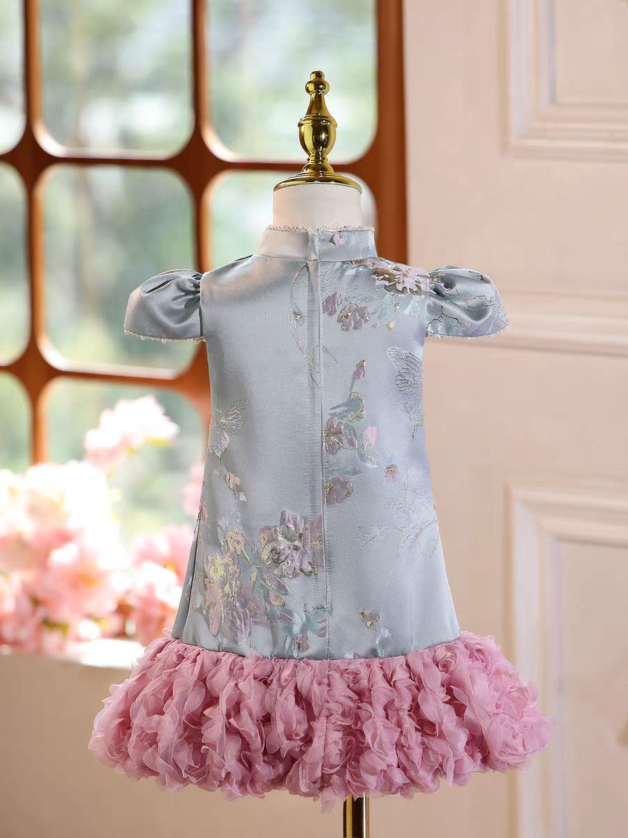 Girls' Modern Cheongsam Dress Blue Jacquard Top with Pink Ruffle Tutu Skirt D249
