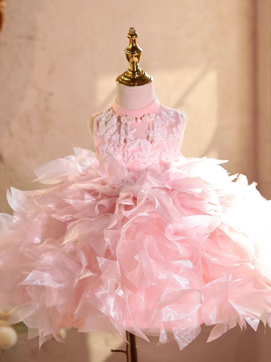Girls' Pink Party Dress High Neck Embroidered Bodice with Layered Organza Skirt D250
