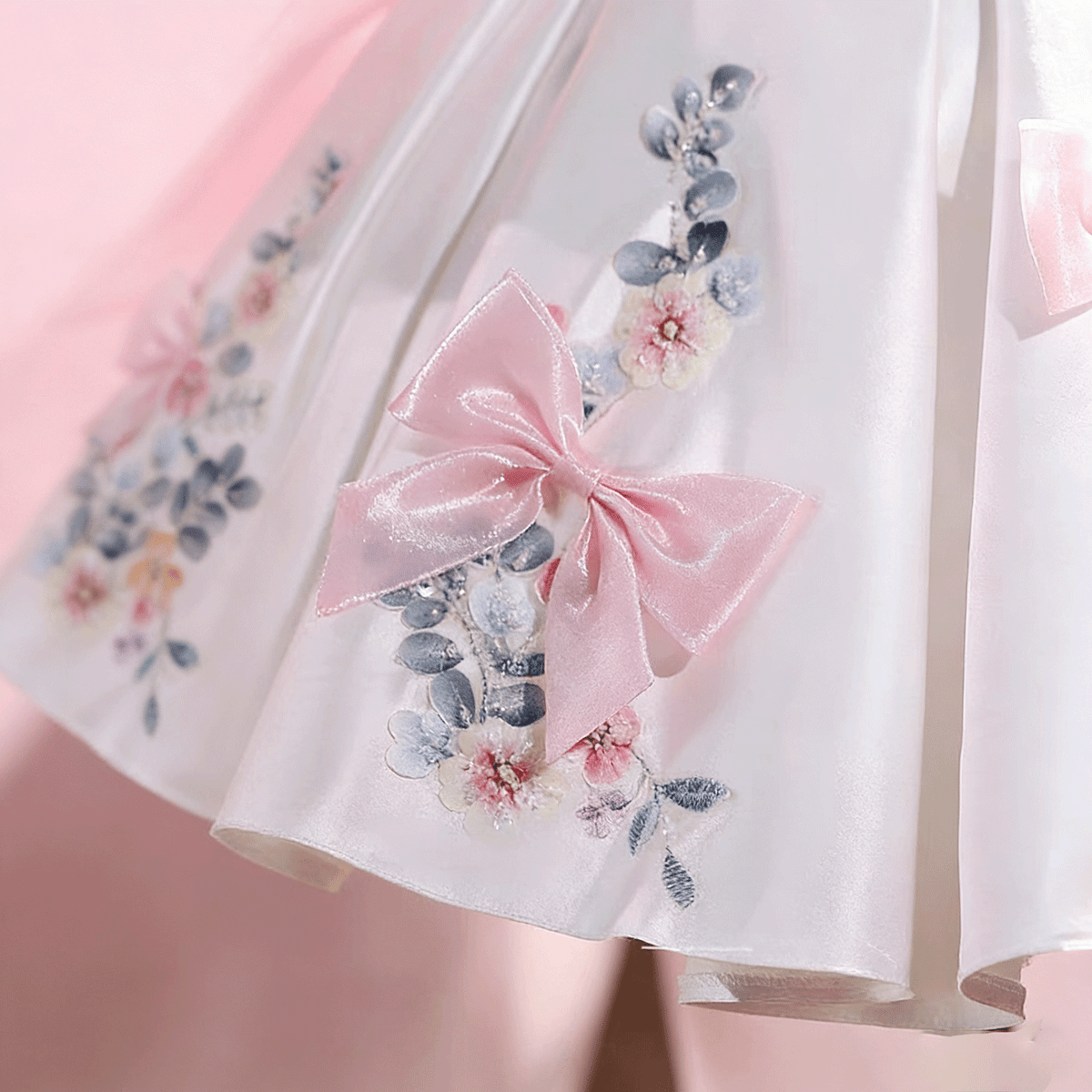 This enchanting off-shoulder satin dress features delicate white fabric adorned with vibrant floral patterns and eye-catching 3D pink bows that add dimension and charm. The soft, flowing silhouette allows comfortable movement for twirling and dancing, making it perfect for special occasions like birthday parties, weddings, and photo sessions. The refined craftsmanship combines elegance with playful details that celebrate childhood wonder. Designed to make your toddler feel truly special, this dress creates unforgettable moments while ensuring she stays comfortable throughout the celebration.