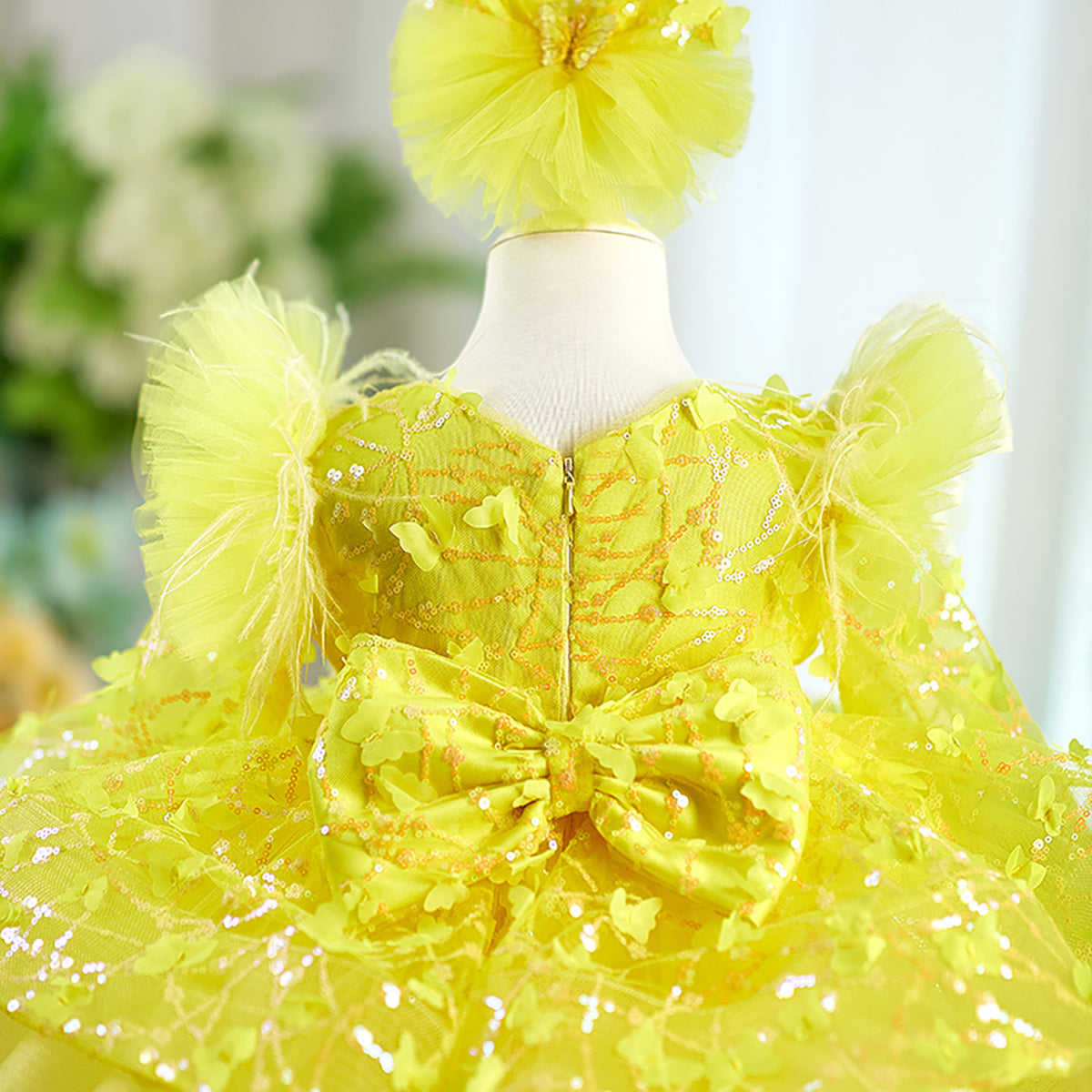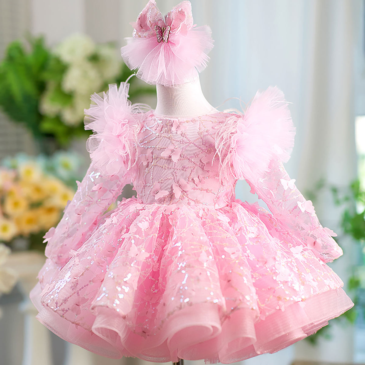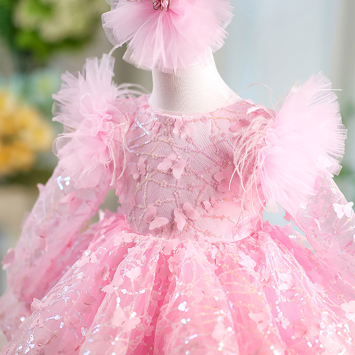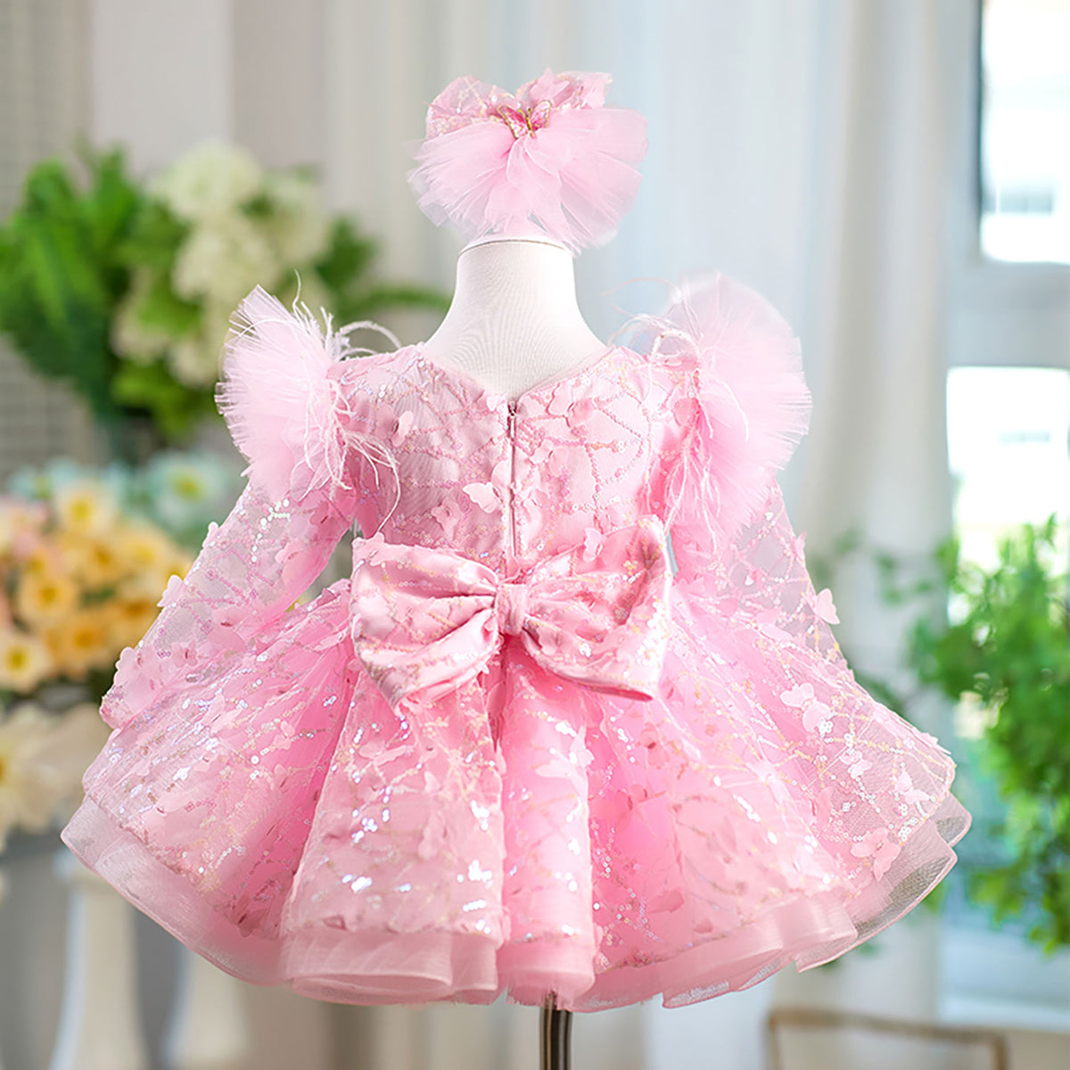 Butterfly Applique Long Sleeves Flower Girl Dress Bowed J555