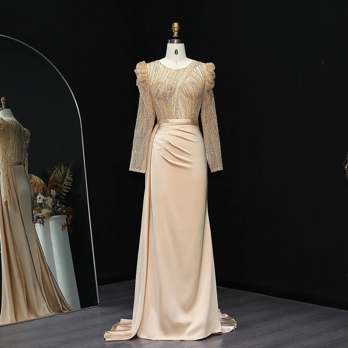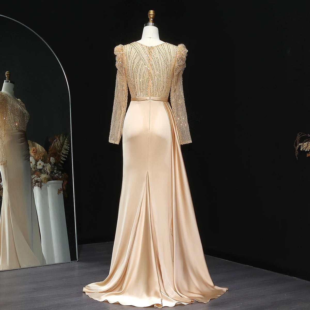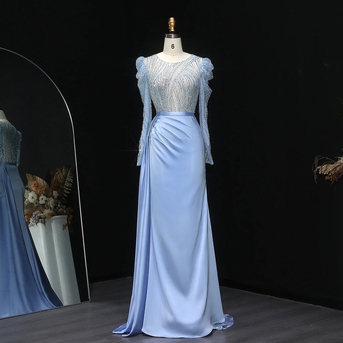 Crafted for sophistication and grace, our Elegant Gold Mermaid Long Sleeves Evening Dress Blue SS072 is a must-have for any formal occasion. With its stunning mermaid silhouette and shimmering gold accents, this dress is designed to make you stand out effortlessly. The long sleeves add a touch of elegance and warmth, perfect for cooler evenings. Elevate your style with this truly elegant dress.