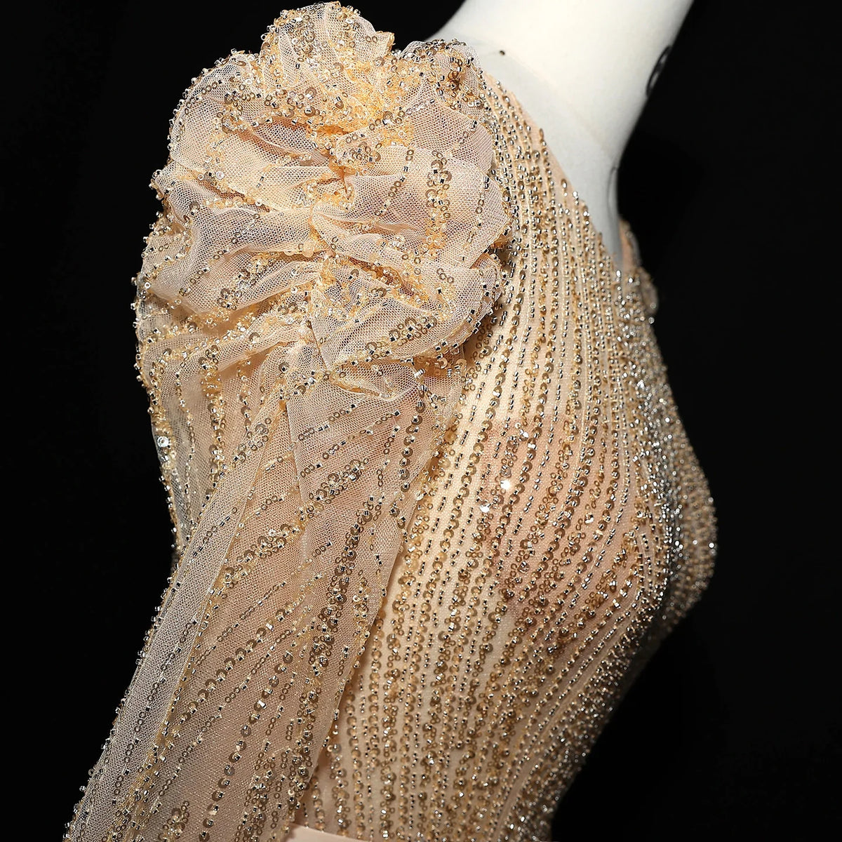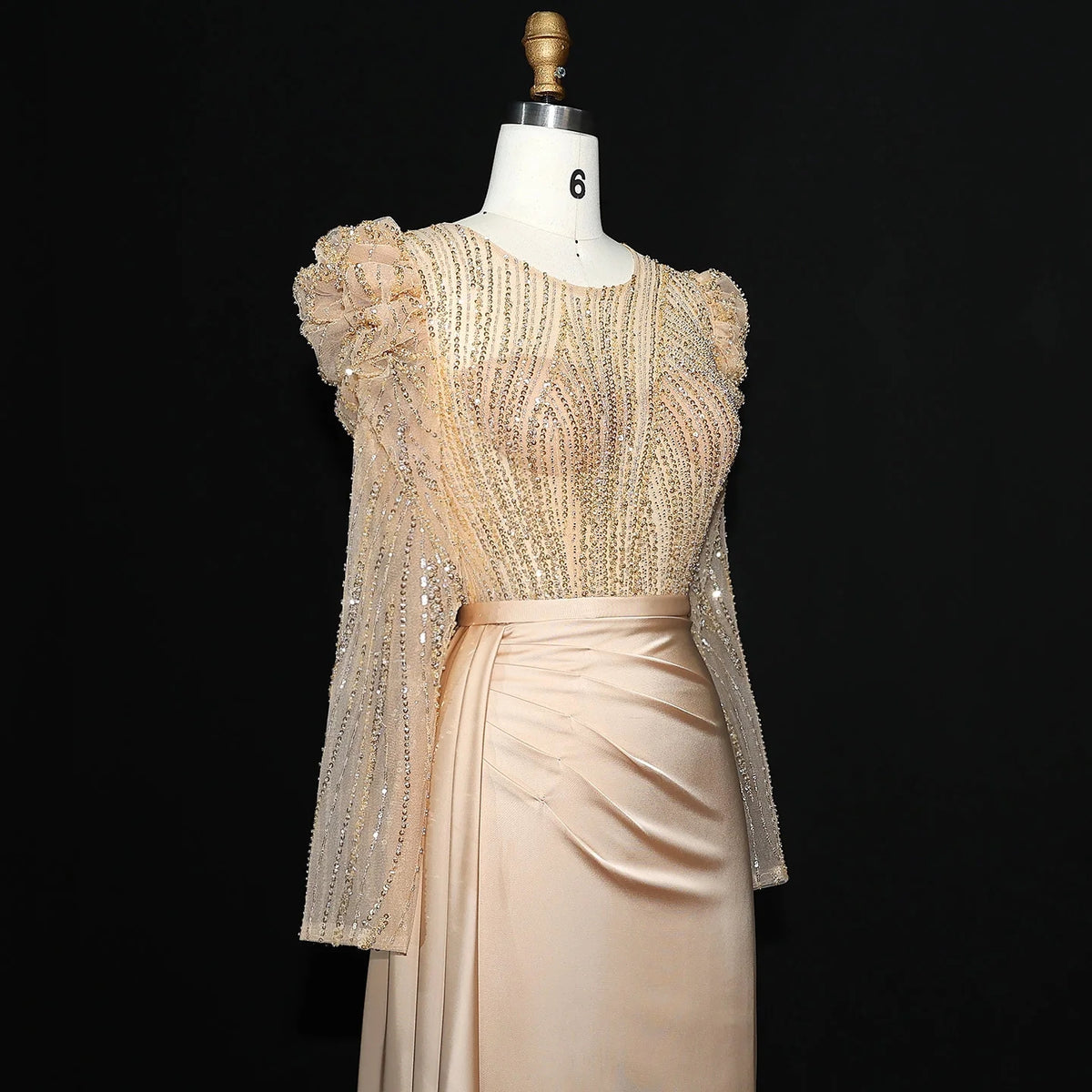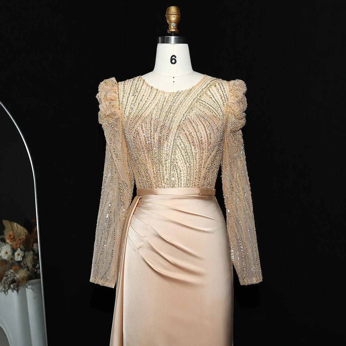 Crafted for sophistication and grace, our Elegant Gold Mermaid Long Sleeves Evening Dress Blue SS072 is a must-have for any formal occasion. With its stunning mermaid silhouette and shimmering gold accents, this dress is designed to make you stand out effortlessly. The long sleeves add a touch of elegance and warmth, perfect for cooler evenings. Elevate your style with this truly elegant dress.
