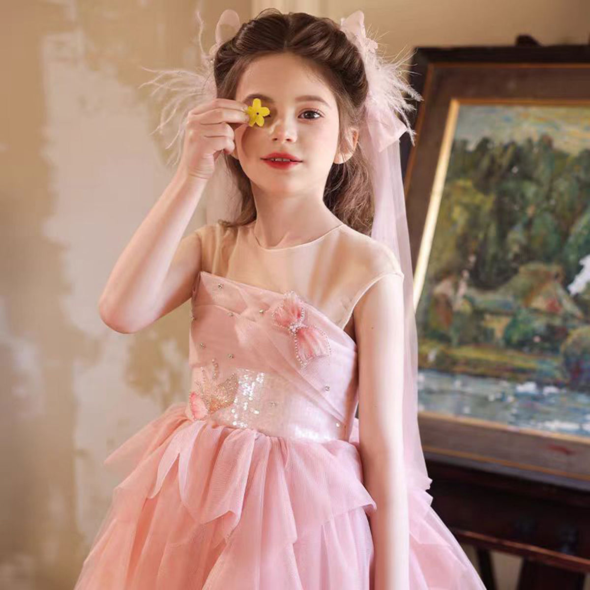 Strapless Sequined Bow Tulle Flower Girl Dress Sleeveless Pink J527