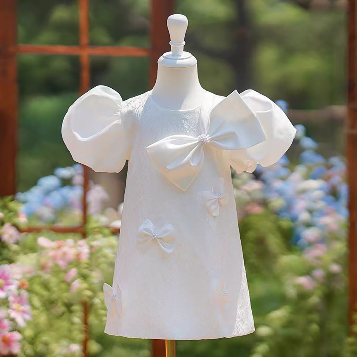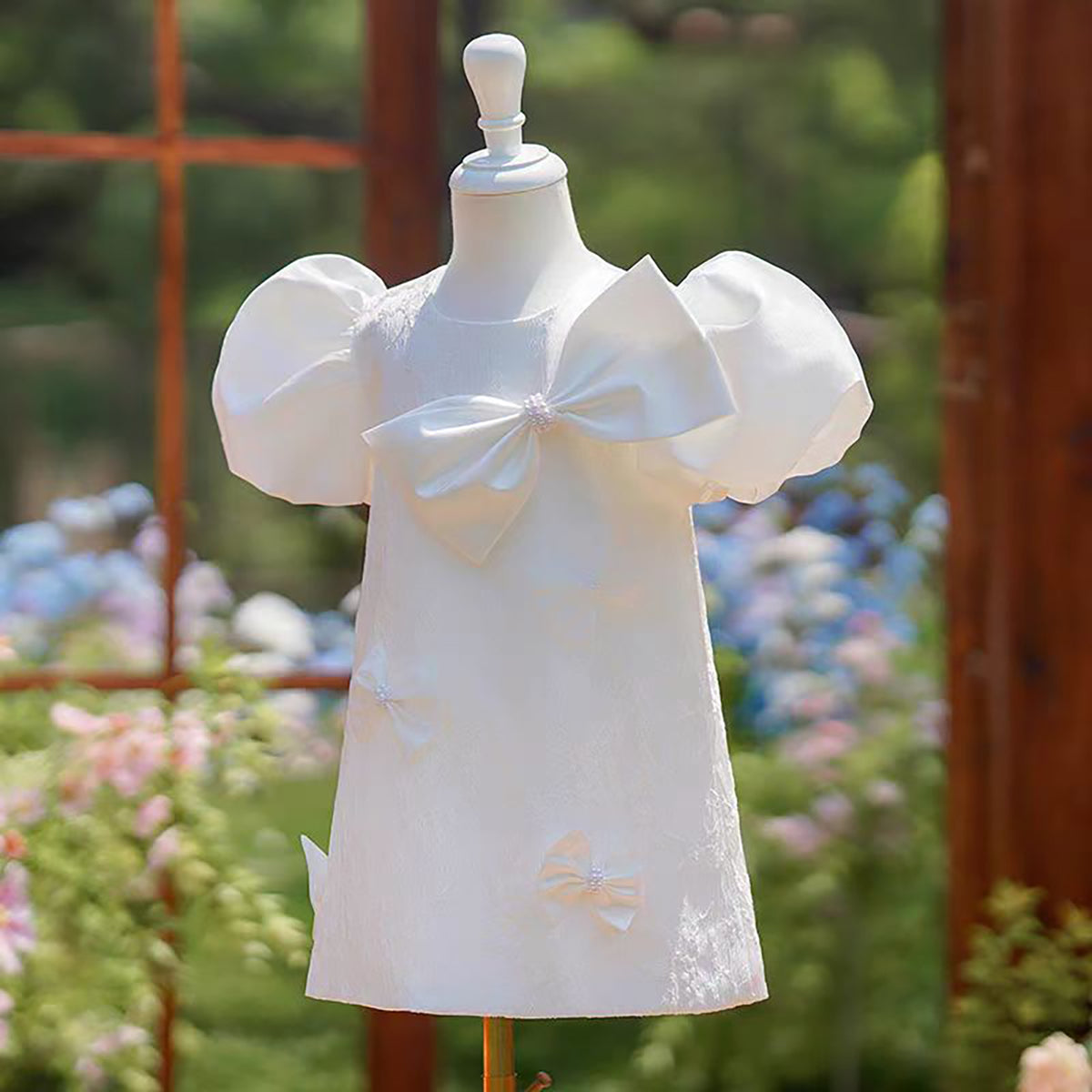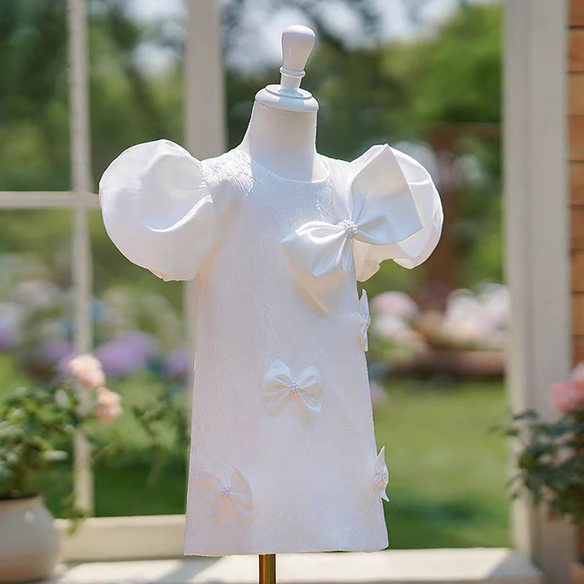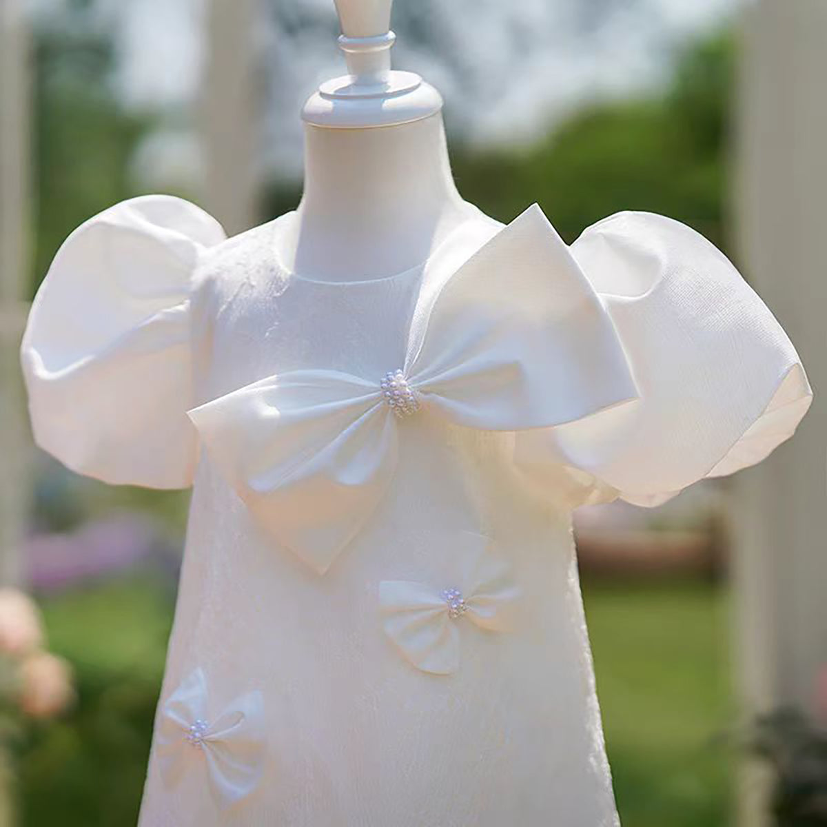 White Puff Sleeve Knee Length Flower Girl Dress with Bow D078