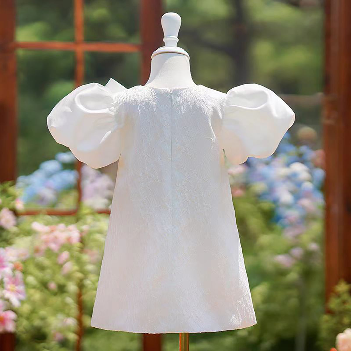 This white flower girl dress features elegant puff sleeves and a knee-length design, complemented by a tasteful bow for added charm. Crafted with attention to detail, it offers both comfort and style, making it an excellent choice for formal events and weddings. The dress ensures ease of movement while maintaining a classic, refined look suitable for young girls on special occasions.