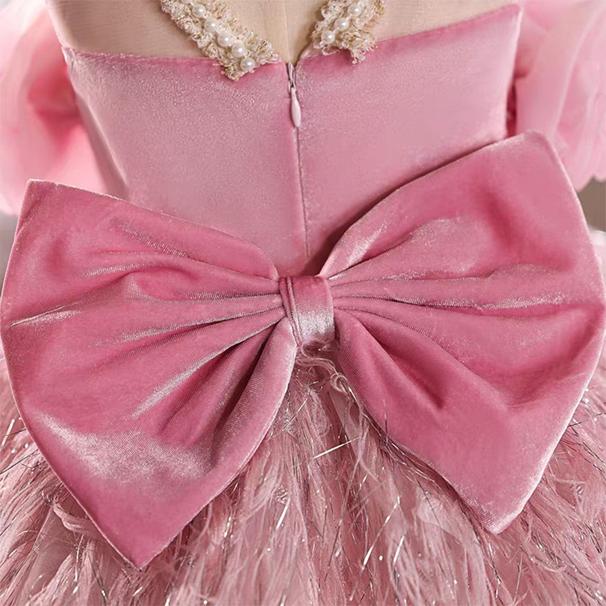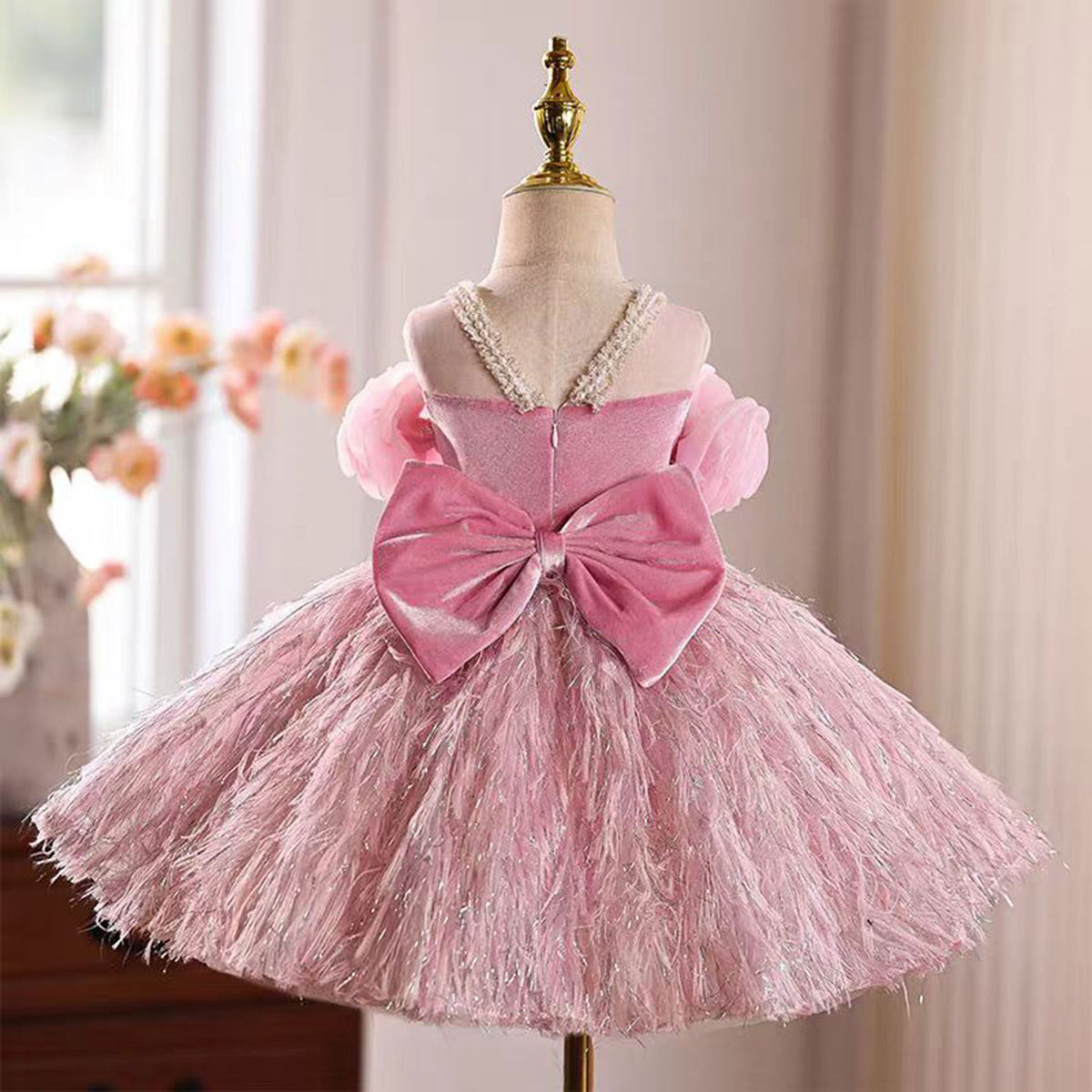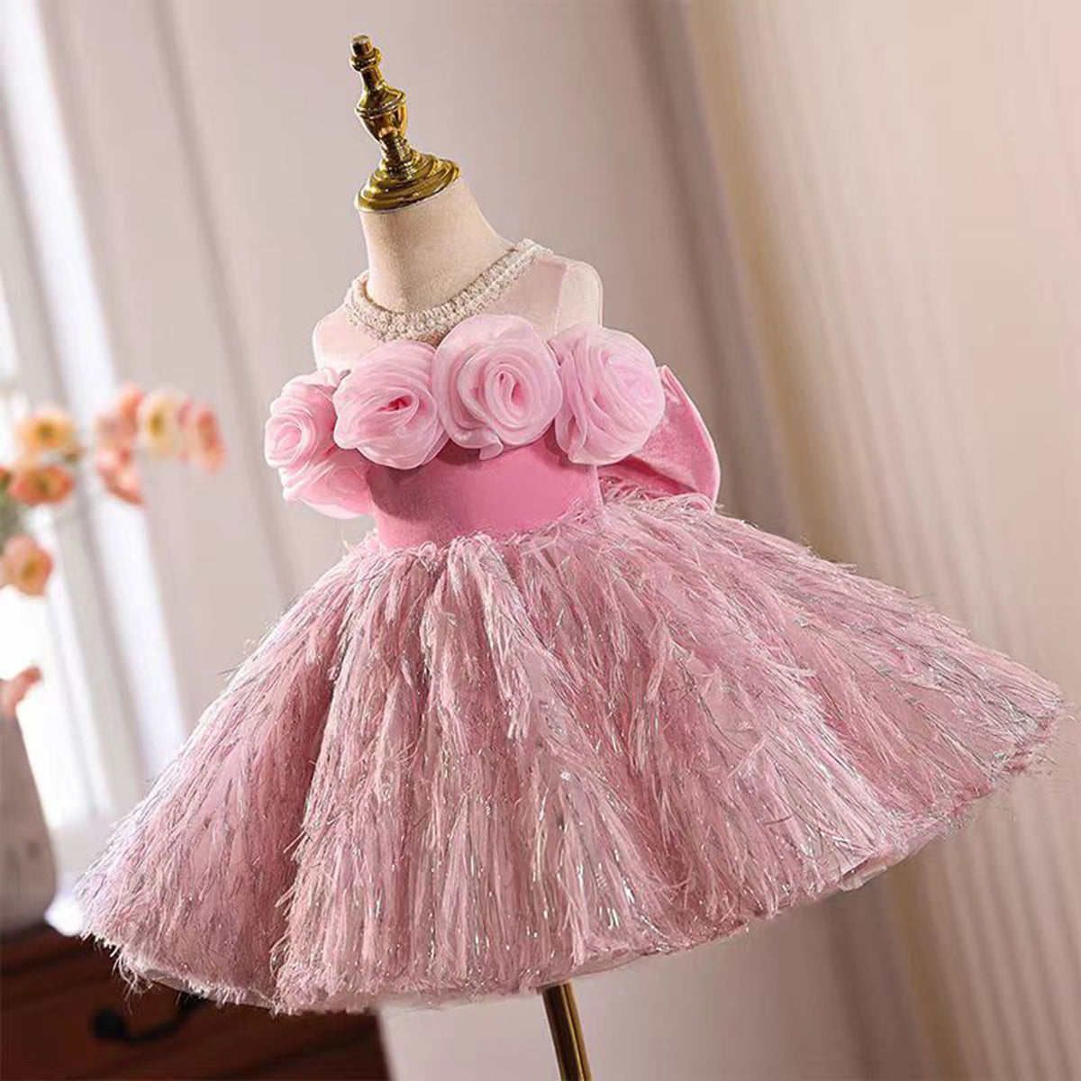 3D Flowers Fur Pink Girl Dress With Bow Sleeveless D016