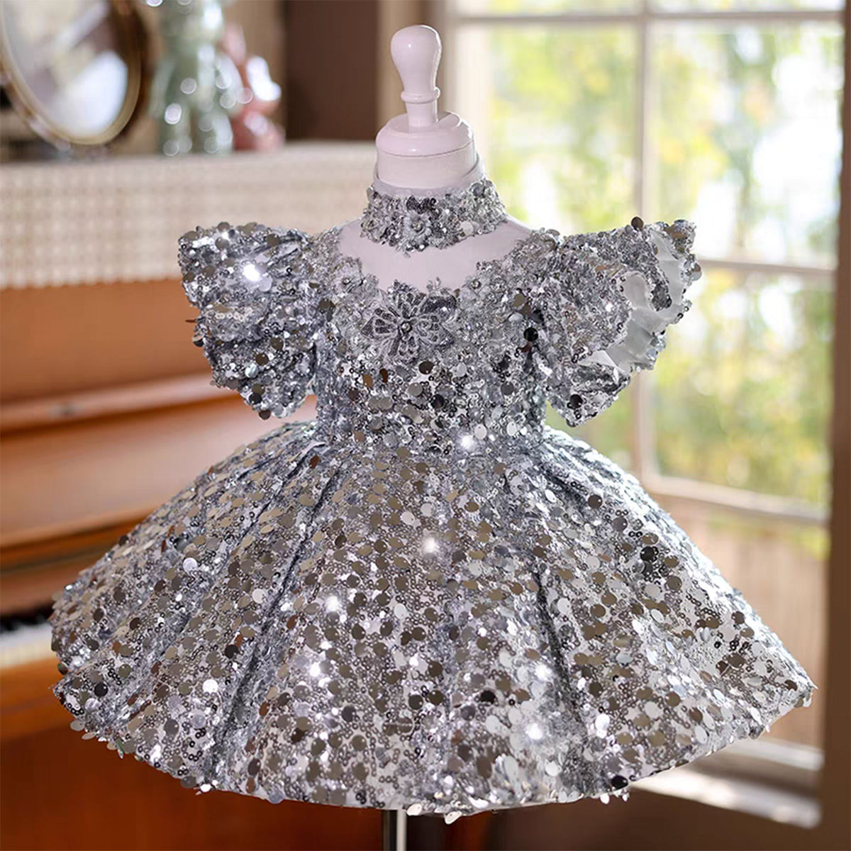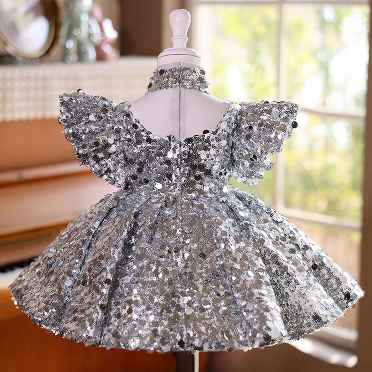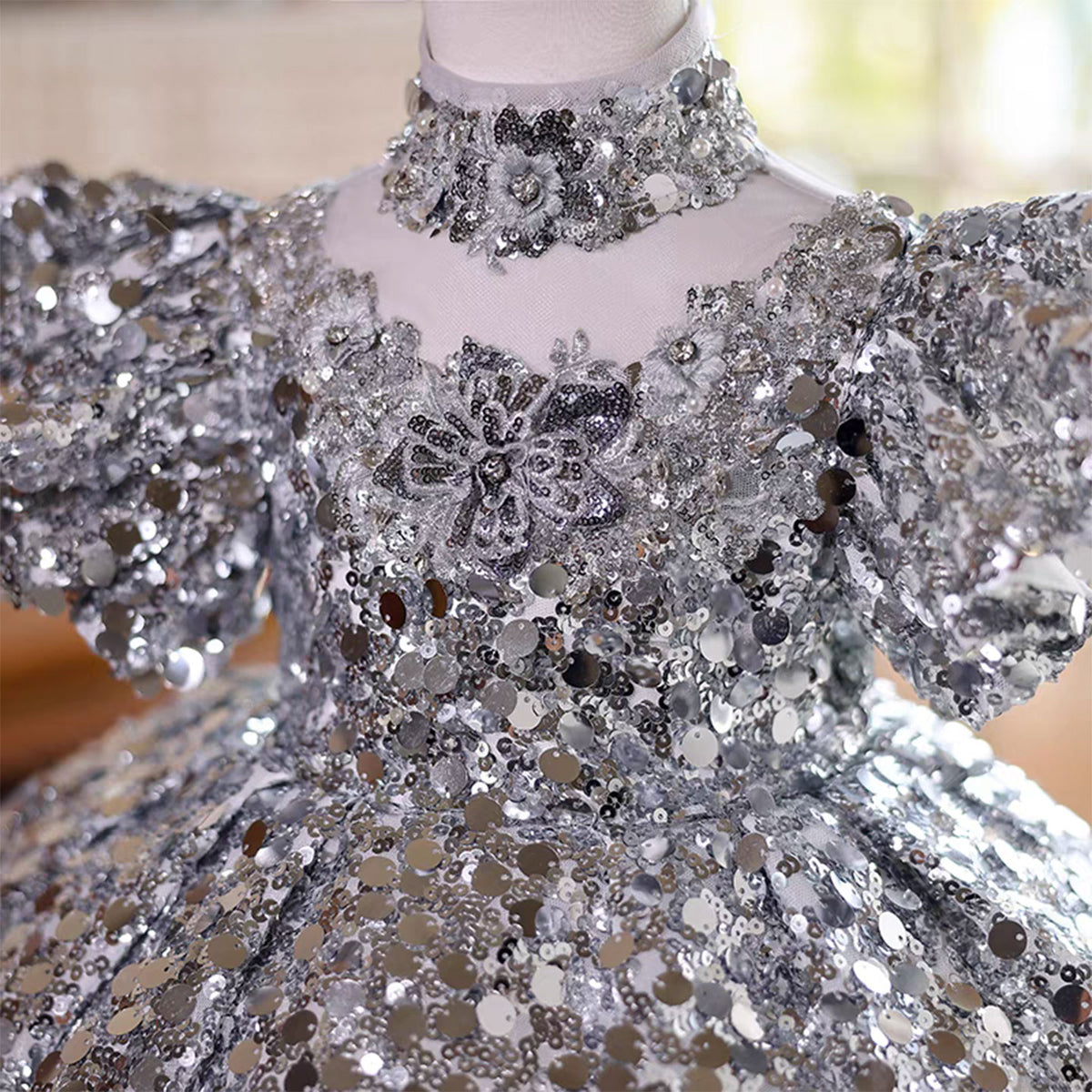 Luxury Applique Sequined Girl Dress With Neck Gait Silver J828