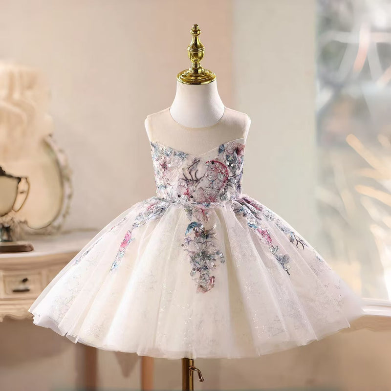Appliques Girl Dress Knee Length Princess Birthday Party Gown D034