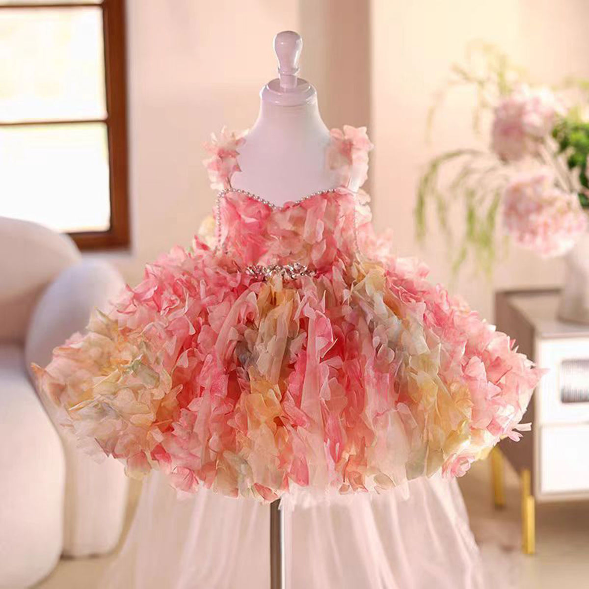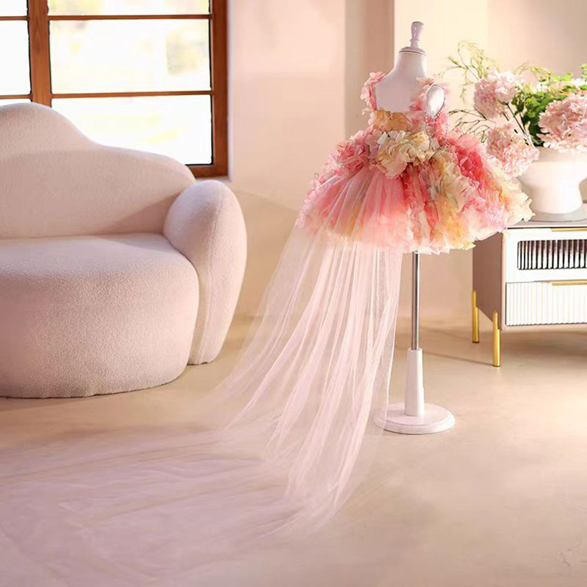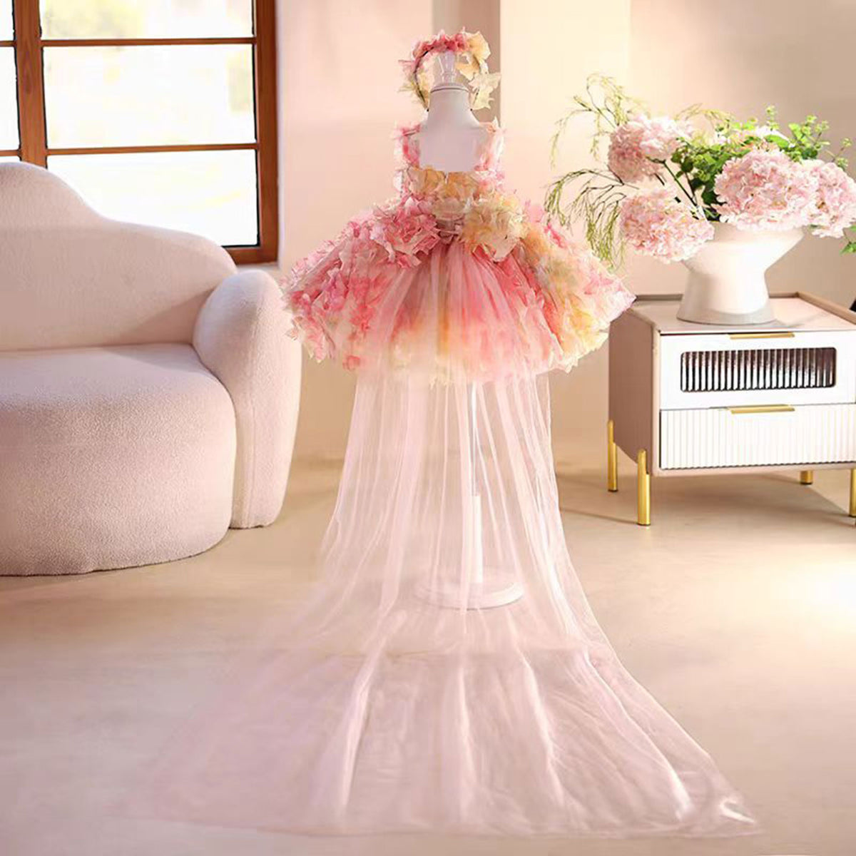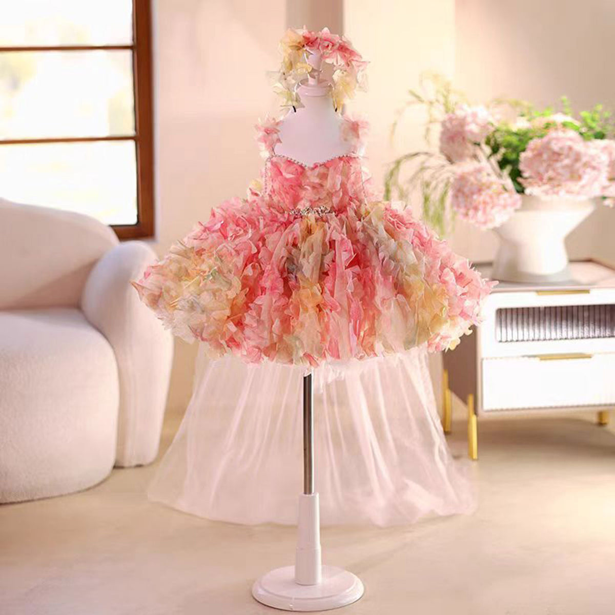 This delicate pink flower girl dress features a graceful sling design adorned with pearl embellishments, adding a touch of elegance and charm. Crafted from soft tulle, it offers a lightweight and comfortable fit, perfect for special occasions. The intricate floral details enhance its sophisticated appeal, making it an ideal choice for memorable events.