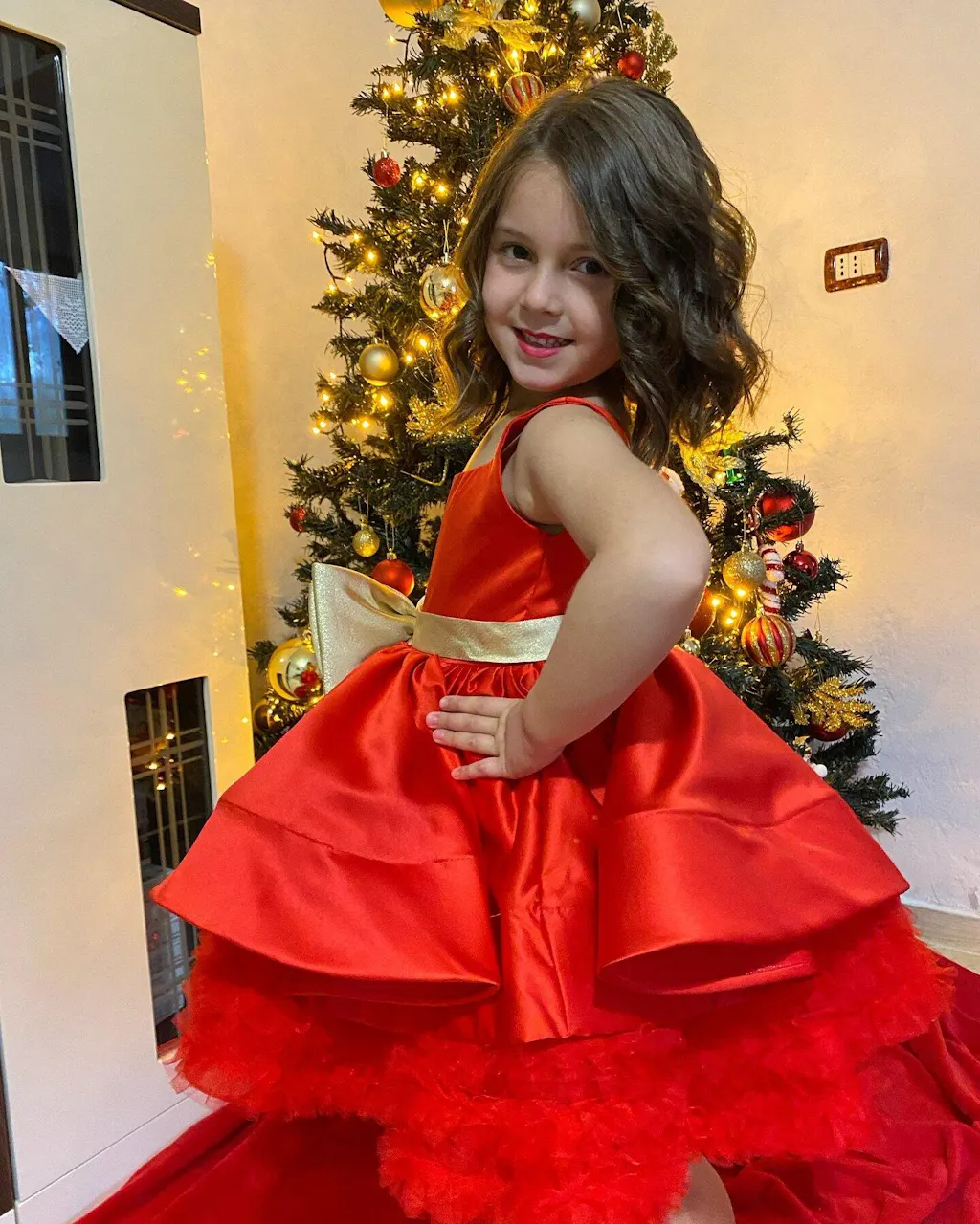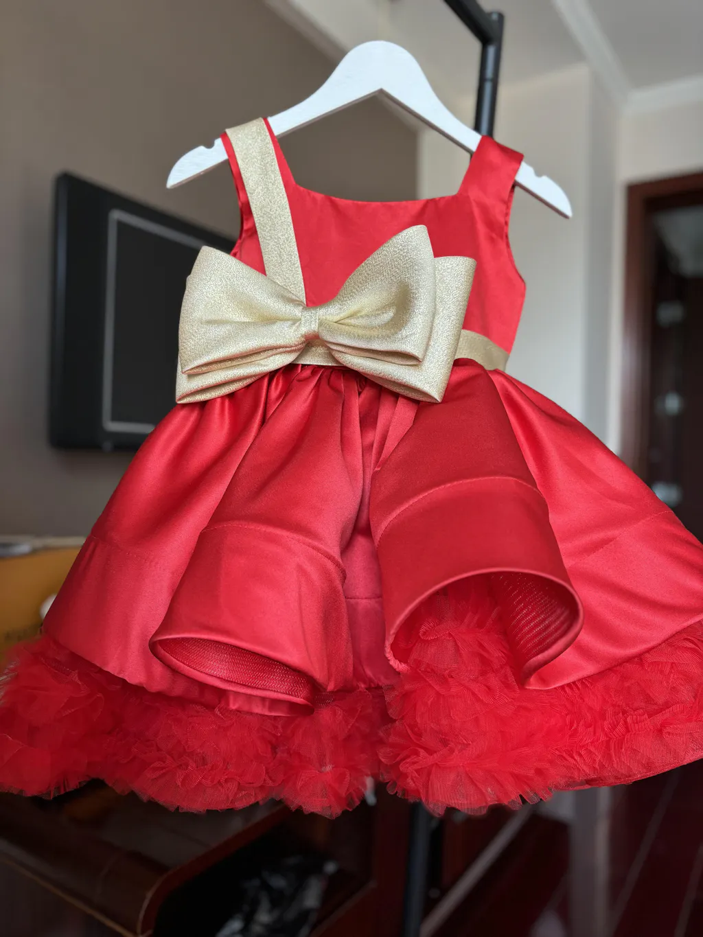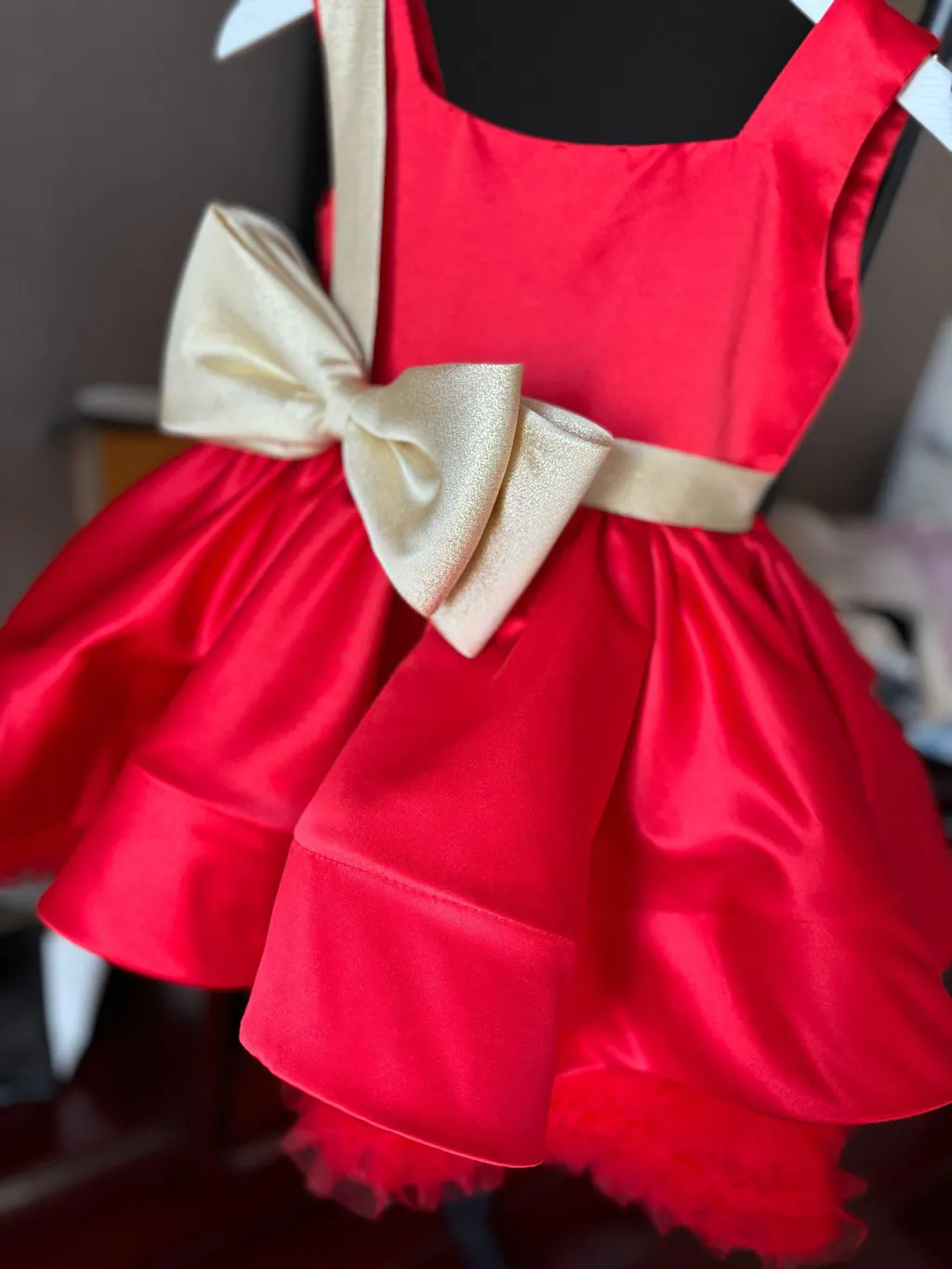 Red Christmas Satin Girl Dress Knee Length with Bow J285