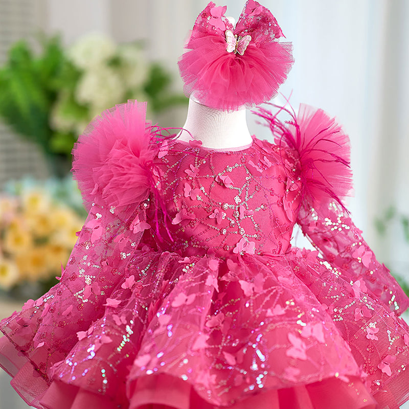 Sequins Pink Girl Dress Knee Length Train Long Sleeve Princess J282