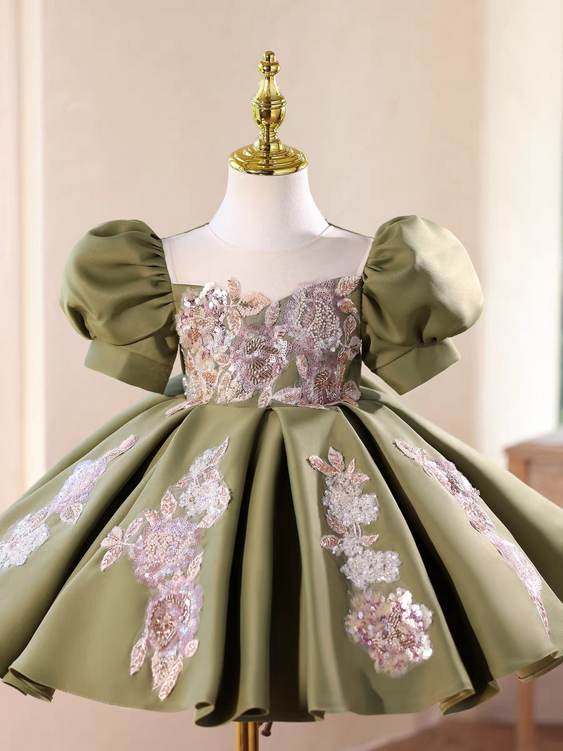 Sage Green Satin Girl Princess Dress Toddler Kids 1st Birthday Party Gown J460
