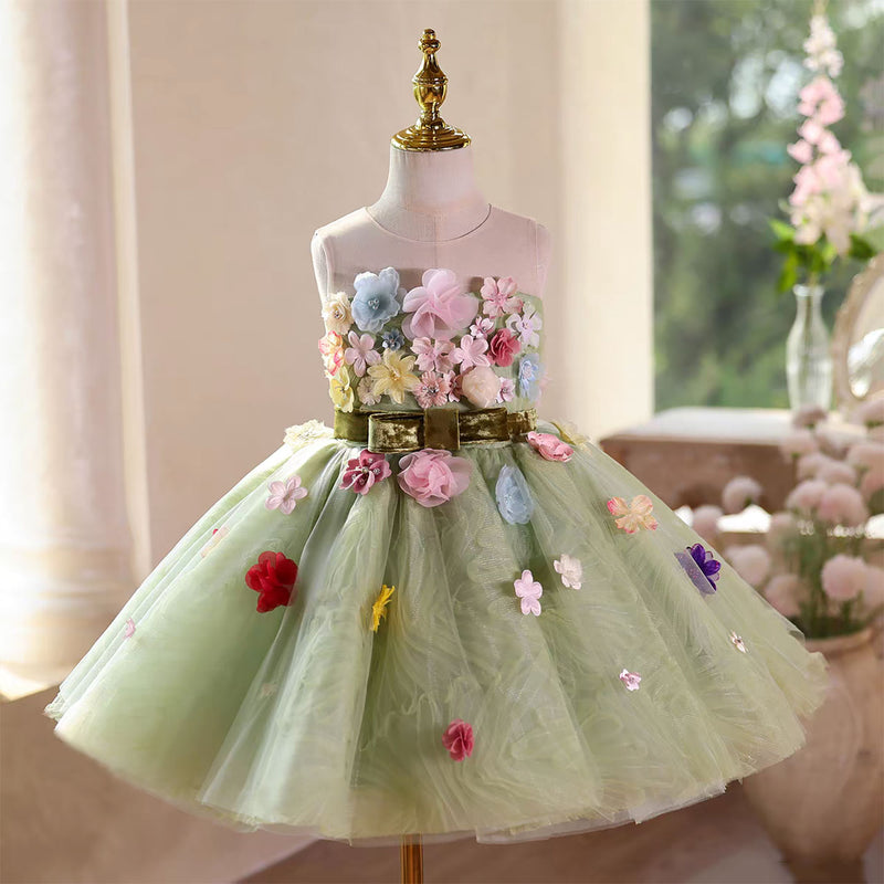 Green Flower Girl Dress 3D Flowers Birthday Garden Wedding J578