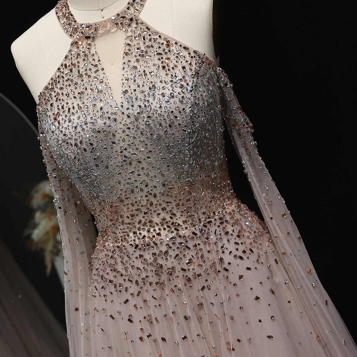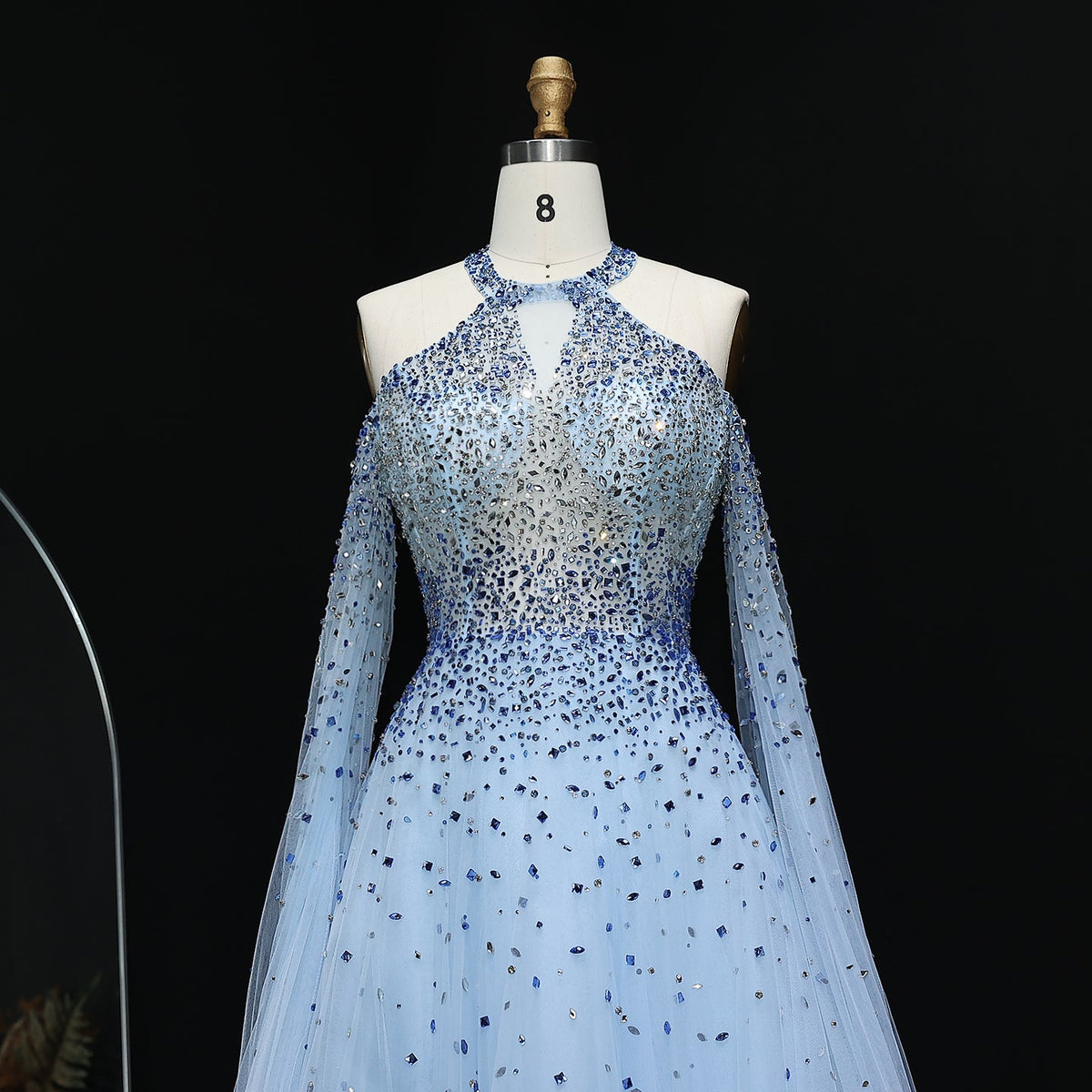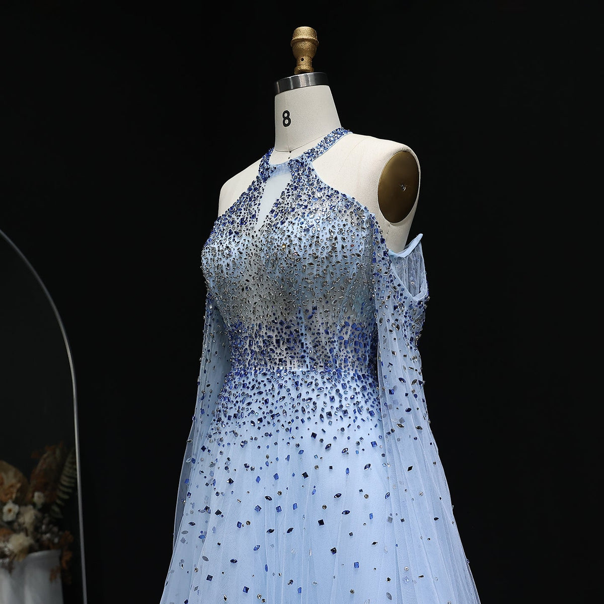 Luxury Crystal Halter Blue Evening Dress with Cape Sleeve SS096