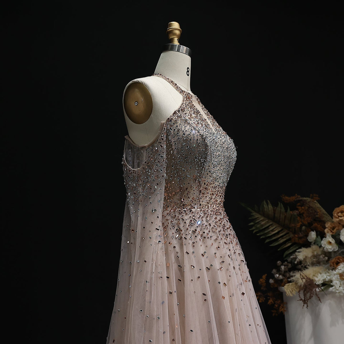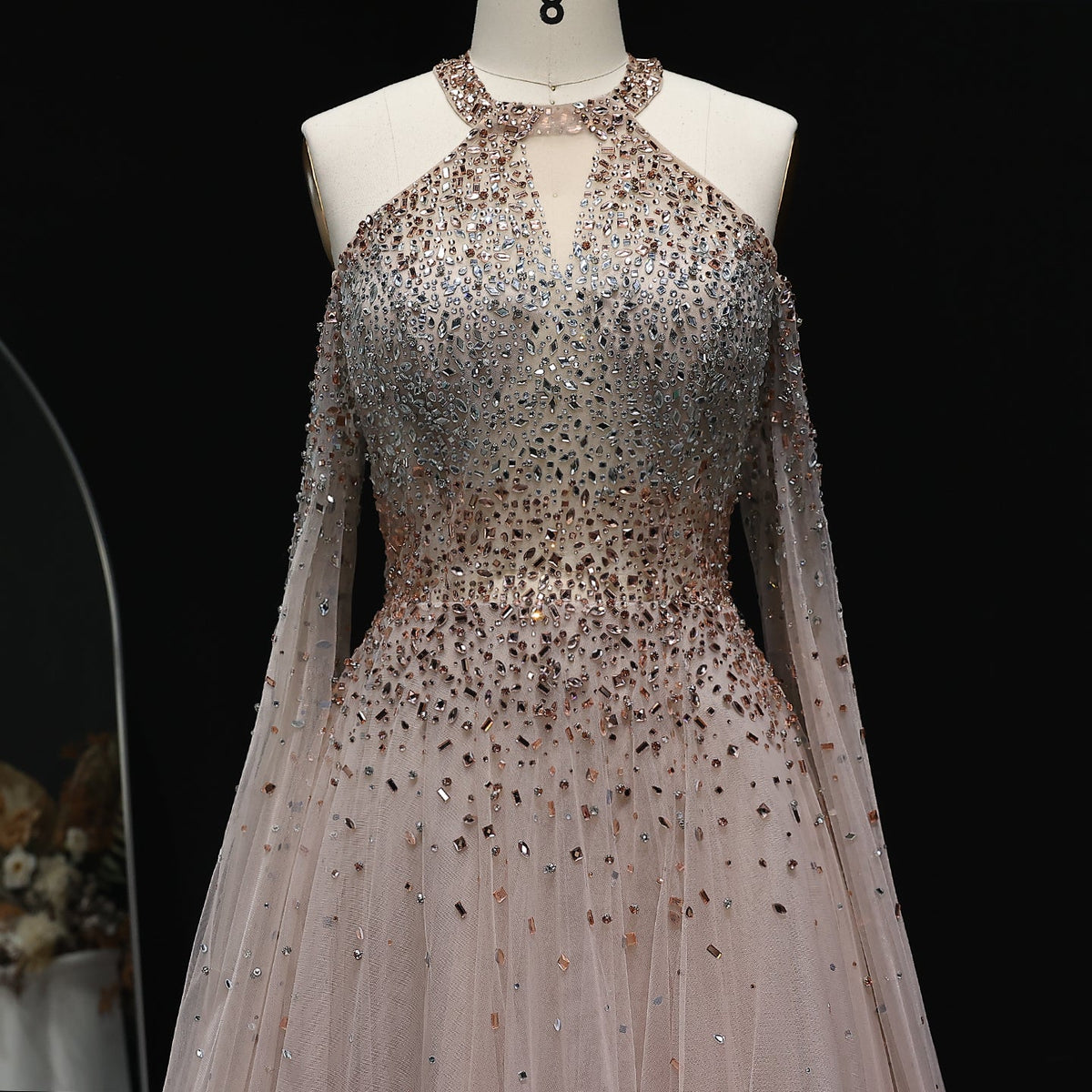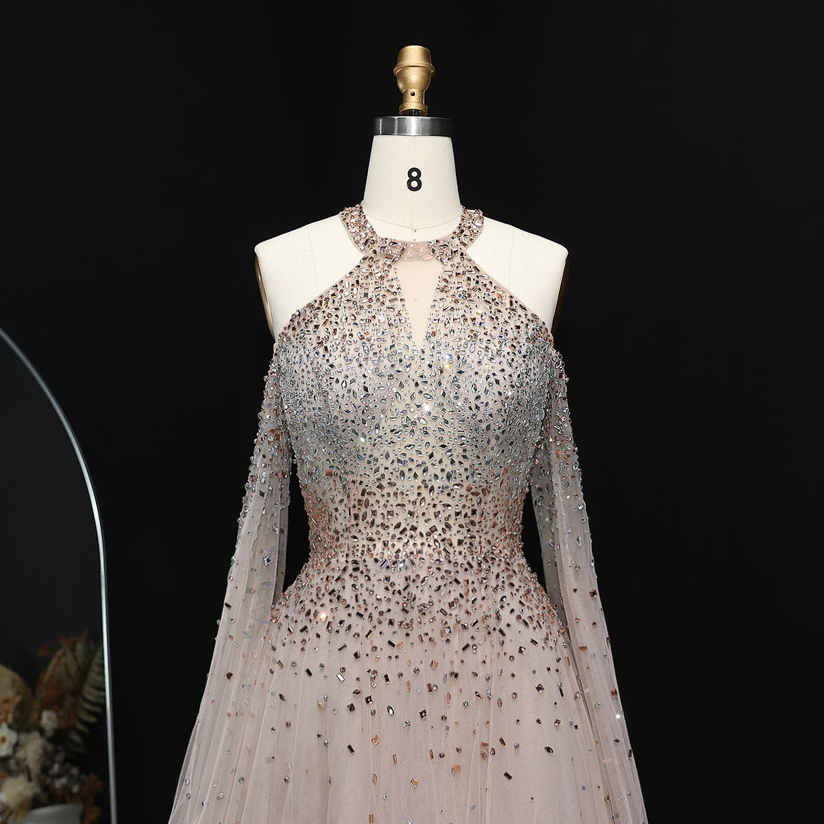 Luxury Crystal Halter Blue Evening Dress with Cape Sleeve SS096