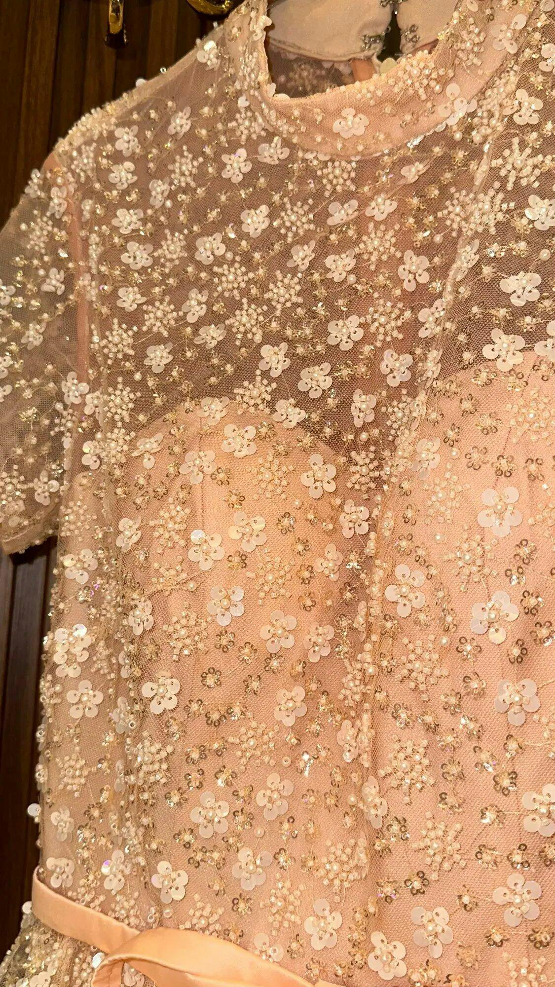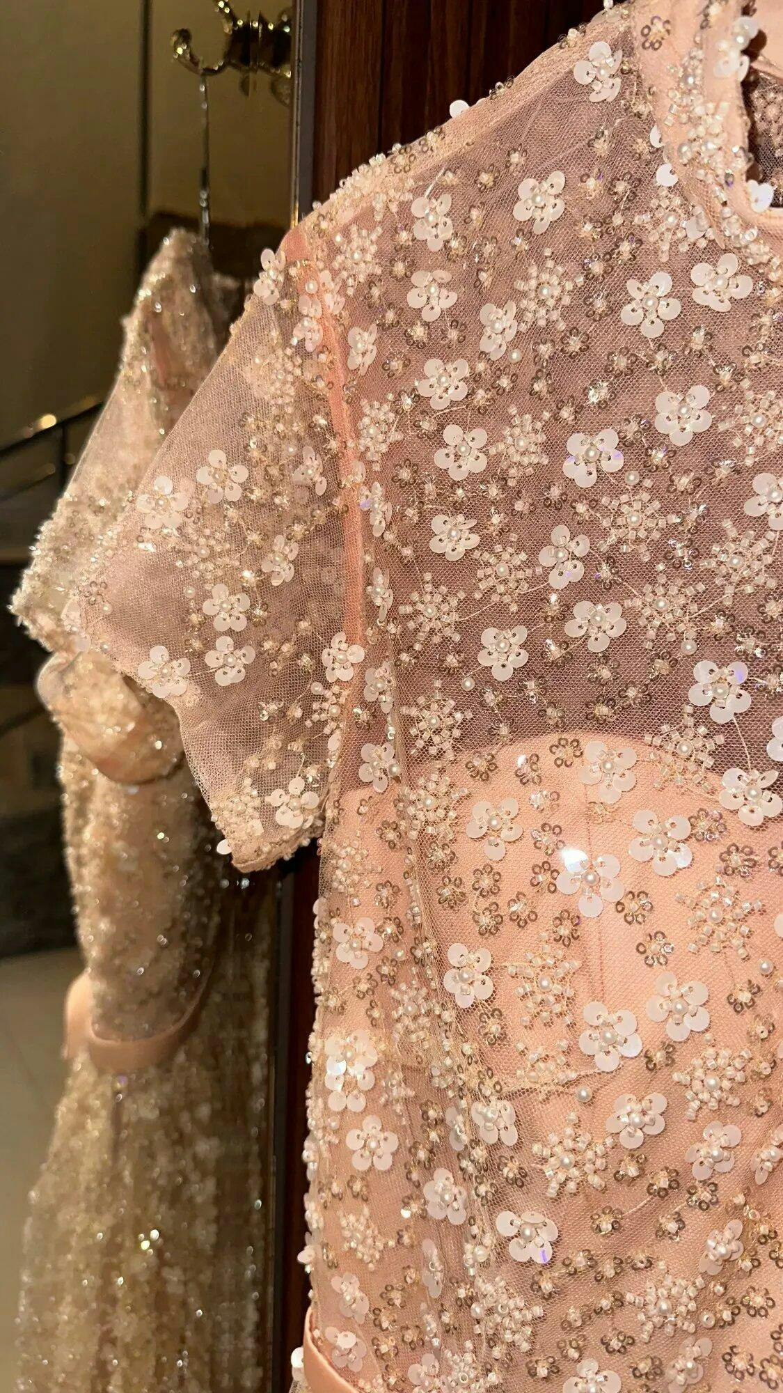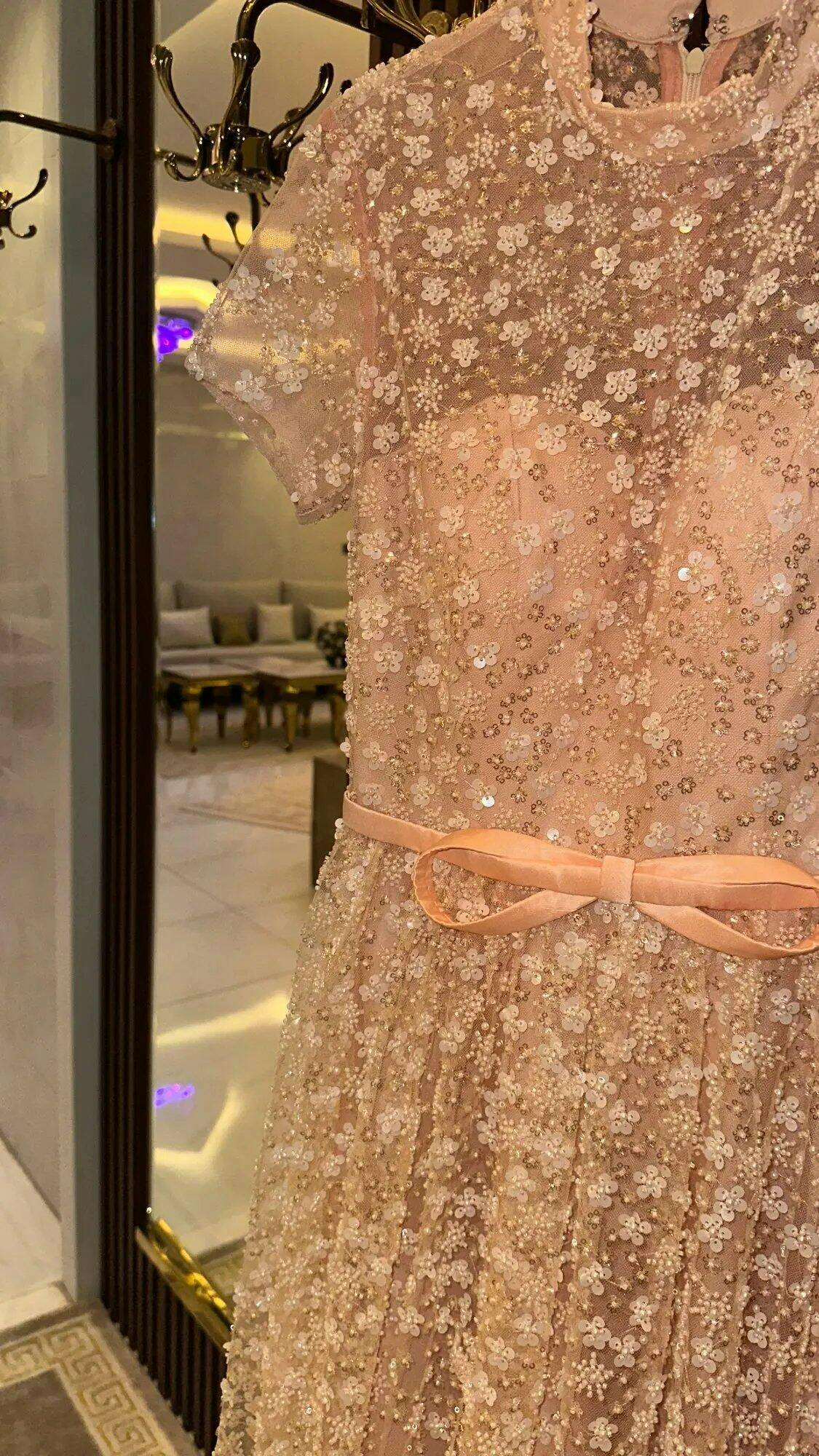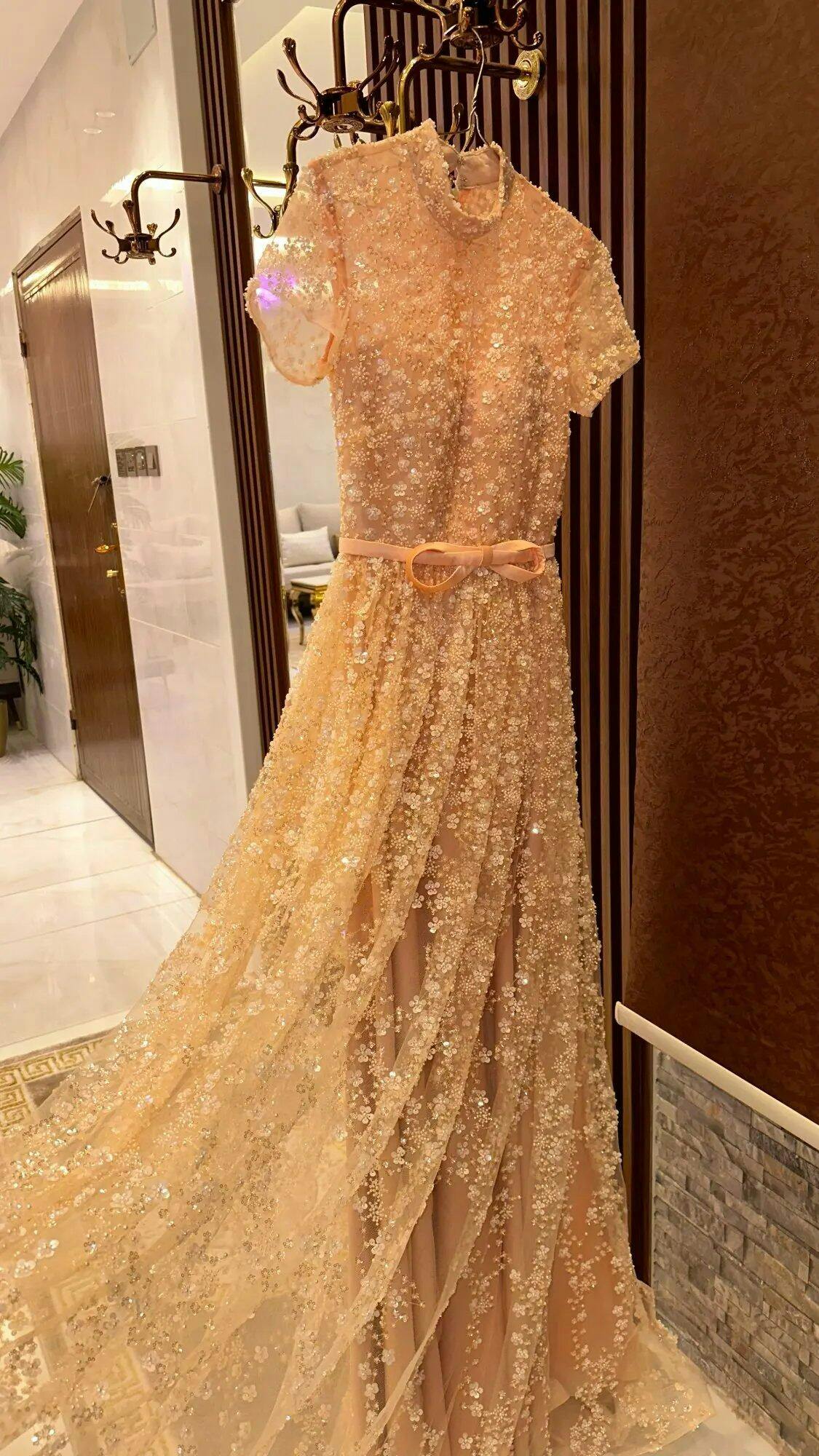 This elegant Peach Embroidered Gown with Bow features intricate embroidery and sparkling beadwork, perfect for a sophisticated and glamorous look. The delicate bow adds a touch of femininity, while the Arabic design adds a unique touch of culture. This stunning gown is the ideal choice for any special occasion.