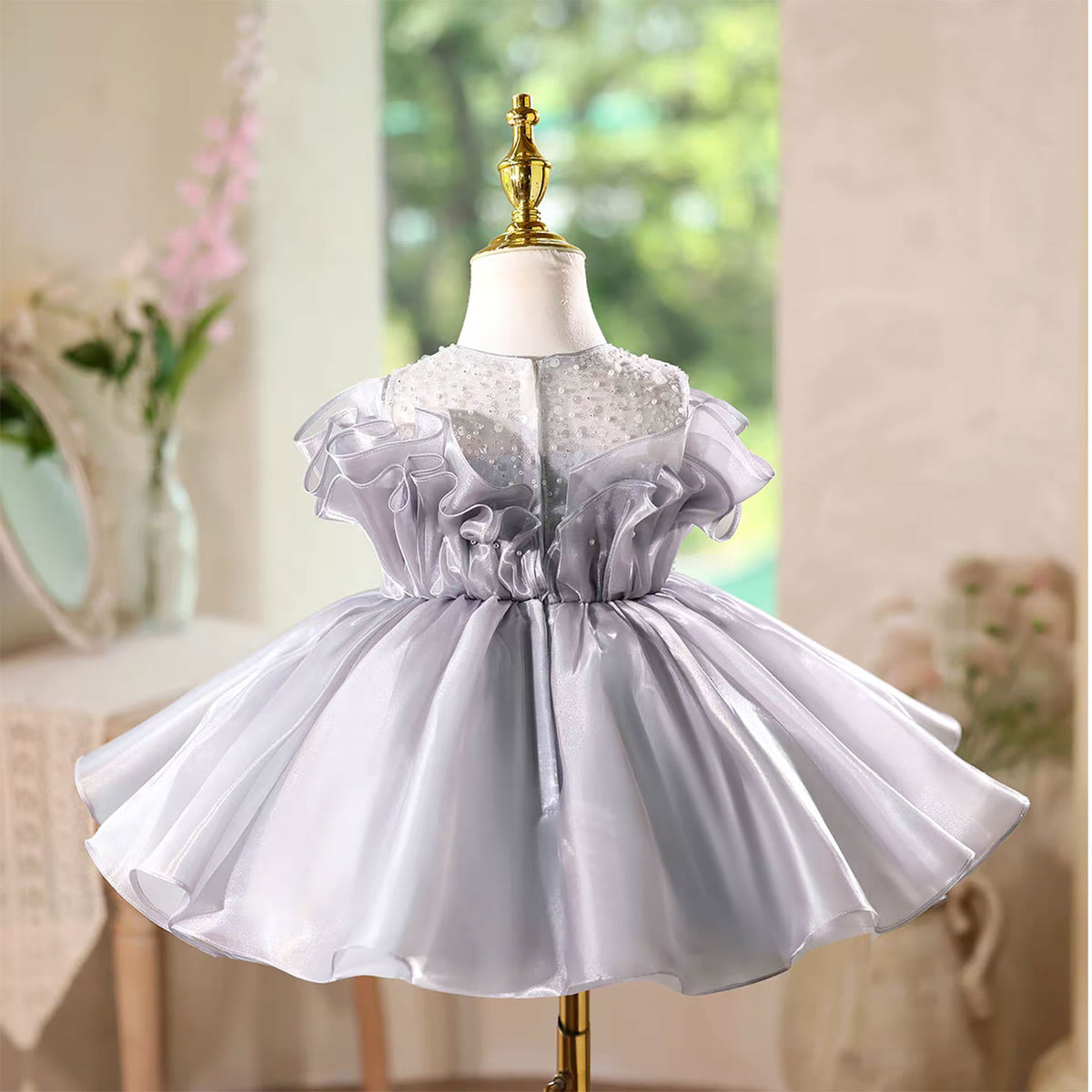 This elegant gray satin flower girl dress features delicate applique and pearl detailing, complemented by soft ruffles for a refined look. Crafted with attention to detail, it offers a sophisticated style perfect for special occasions, ensuring comfort and grace for your little one.