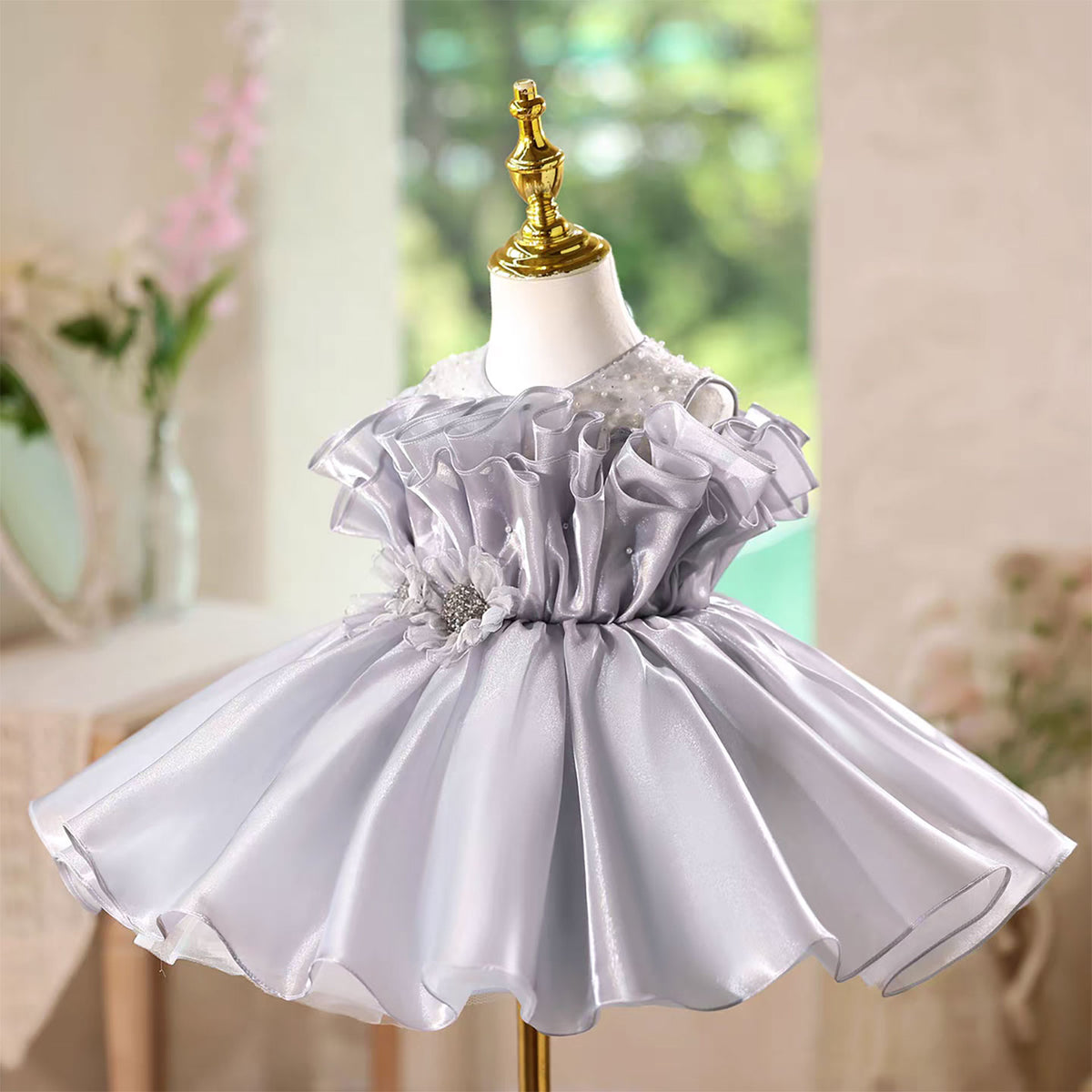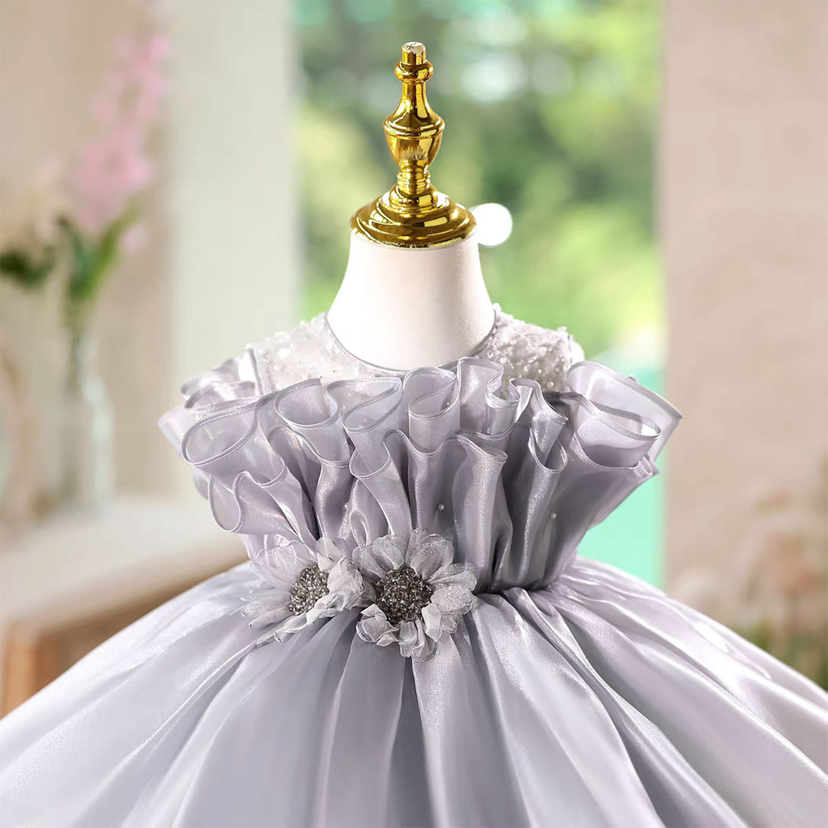 Gray Applique Pearl Ruffle Satin Flower Girl Dress J568
