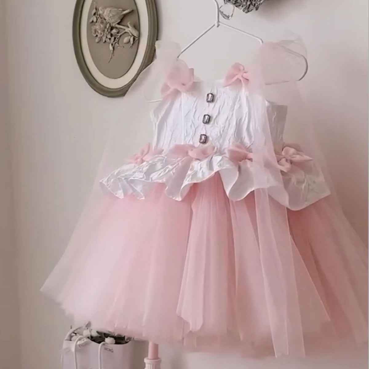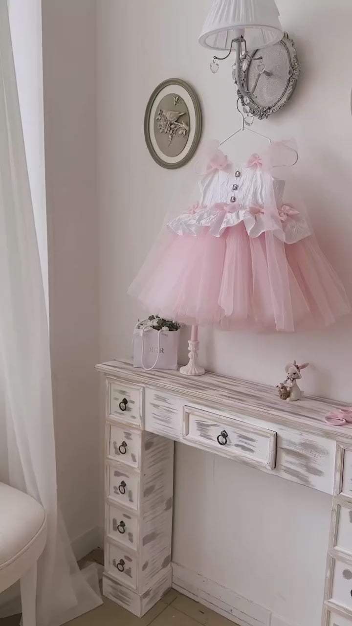 This charming pink flower girl dress features delicate tulle layers and ruffled details, creating a soft, elegant silhouette. The knee-length design ensures comfort and ease of movement, while the cute bow adds a refined touch. Perfect for weddings and special occasions, this dress combines style and practicality for your little one’s memorable moments.