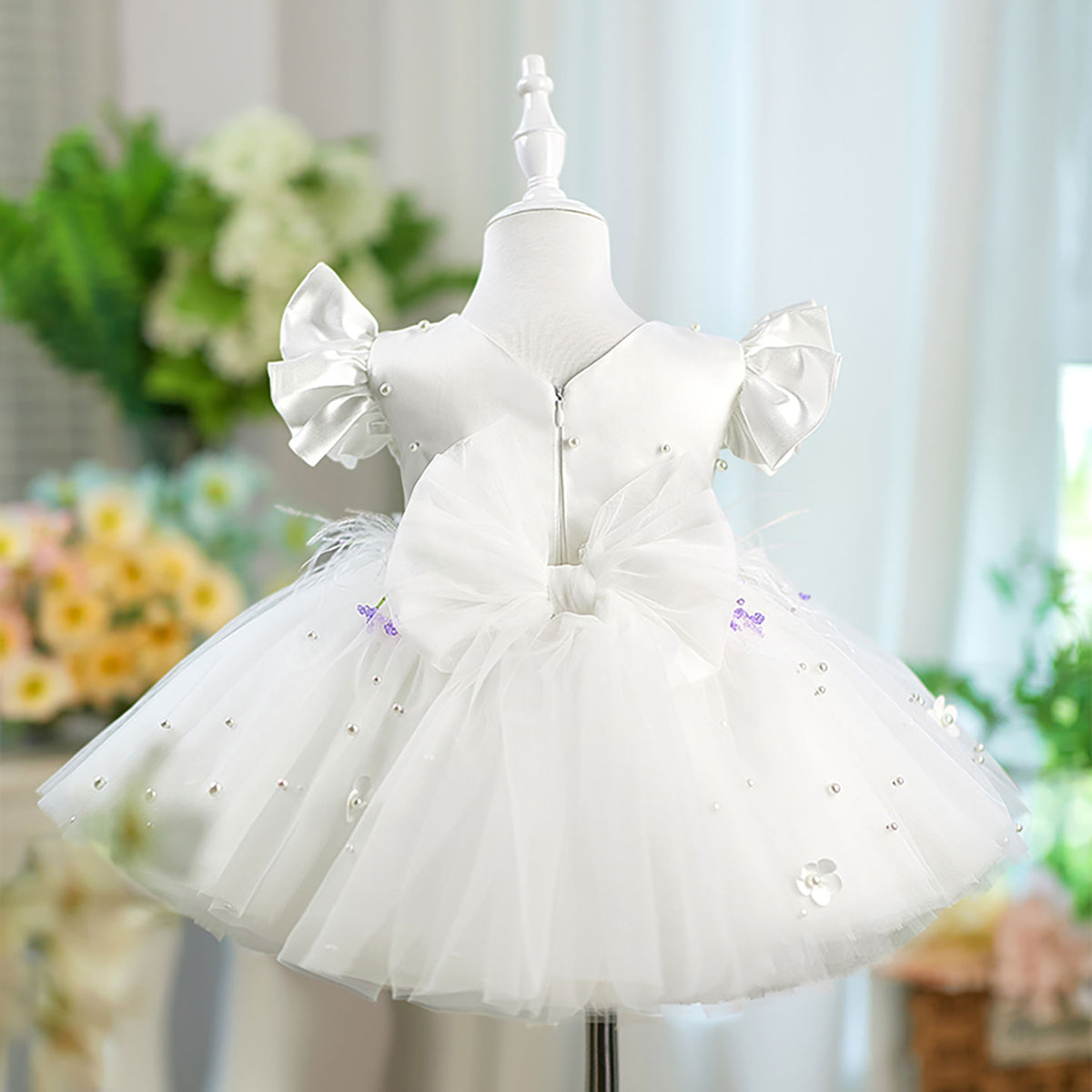 Satin Top Tulle Short Sleeves Bowed Flower Girl Dress D067